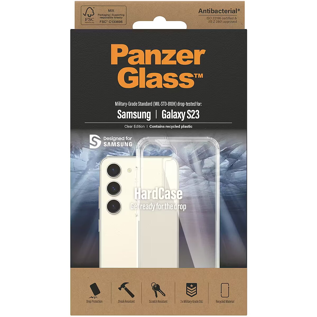 LongDesc - Life is a contact sport. Protect your phone from the bumps and bruises of everyday life with the PanzerGlass® HardCase. Simply snap it on and you’re ready to go. The HardCase features a stiff, transparent back cover surrounded by a softer frame. This combination of materials provides a high level of drop protection. The case has been drop-tested according to 3 x Military Grade Standard, which means that it can withstand several drops from a height of 3.6 meters or a sitting-on-a-balcony-and-accidently-dropping-my-device kind of height.And to top it all off, the HardCase is anti-yellowing so it will continue to look good, day after day – even with heavy use. The case also provides an extra level of protection from germs and bacteria thanks to an antibacterial effect that is proven to kill up to 99.99% of the most common surface bacteria.Our products are designed with a commitment to extend the lifetime of your device. The HardCase frame is made from 100% recycled material and the case comes in FSC™-certified packaging that can be recycled.