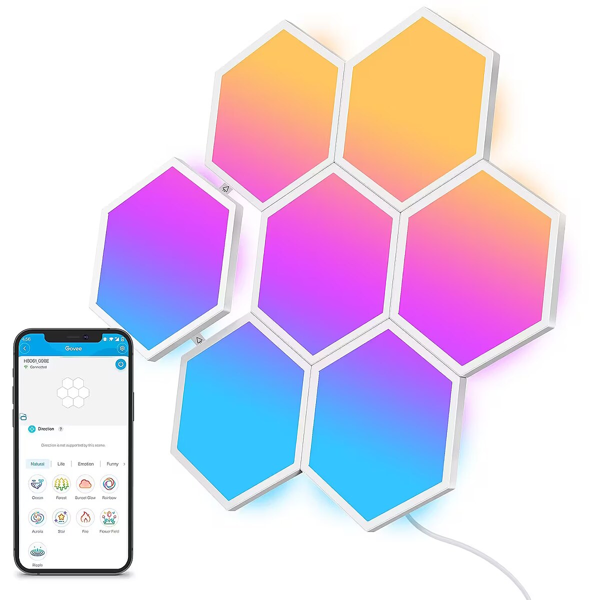 LongDesc - Govee Glide Hexa Light Panels are composed of 10 panels that can be assorted into various shapes. It can be controlled using your favorite voice assistants such as Alexa and Google Assistant as well as the Govee Home App. You can even customize your design, effects, colors, and more.Govee Glide Hexa Light PanelsA Palette of Colors On Every Single Panel.Turn Fantasy into RealityWith RGB, you can only display certain colors on your lights at a time. With Govee's RGBIC technology, you can bring your vision to life by selecting multiple colors at once for a more seamless lighting experience.A Moving Spectacle of LightWith Music Mode, turn the sounds of your music or games into a symphony of flowing light. Choose from a selection of effects on the Govee Home App for a vibrant entertainment experience while watching movies or gaming.Back Light DesignWith a unique transparent shell, your panels will shine onto the walls from behind, adding a fluorescent glow for room and gaming decor like no other. Each panel can display up to 6 colors at once for ultra-smooth flowing animated lighting.Hassle-Free Set UpInstall your light panels without the need for any additional tools. The back adhesive sticks to smooth wall surfaces such as glass, wood, etc. Please ensure the surface is clean before setting up your light panels.28 Preset Lighting EffectsSelect from animated multicolor scene effects such as Energetic, Rainbow, Fire, and Aurora. The Govee Home App will recognize the position of your panels for seamlessly flowing rainbow-like effects across your entire design.DIY Lighting EffectsEasily adjust the flow, color, and direction of your light panels. With DIY Mode on Govee Home App, we offer various options that allow you to create your lighting. Select a variety of colors and effects that are unique to you.