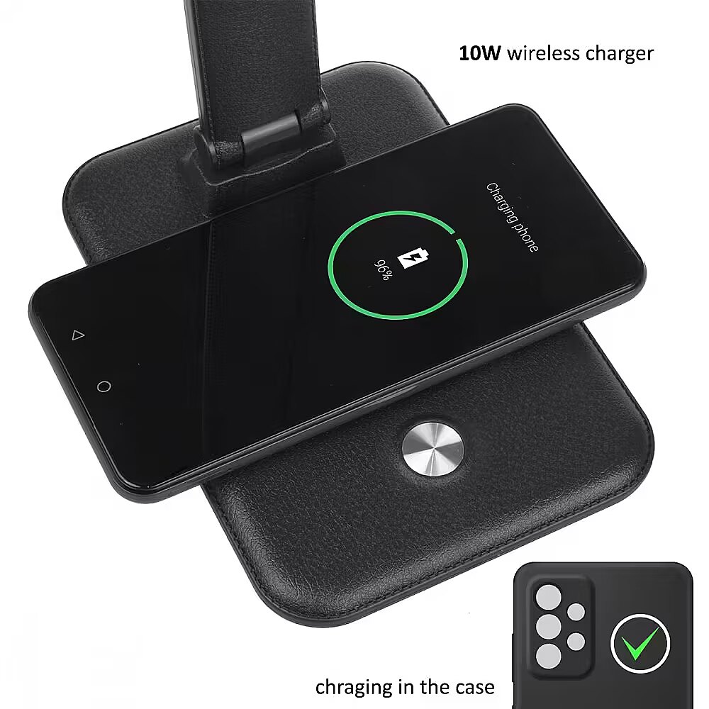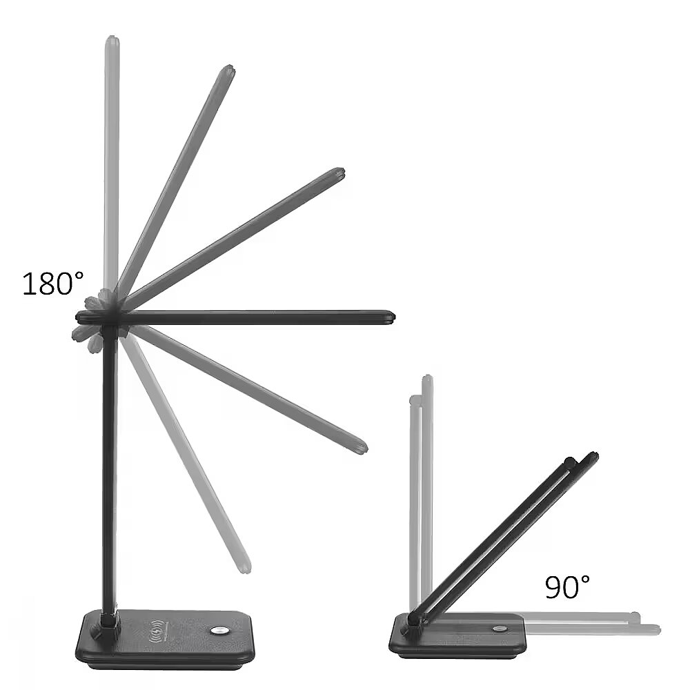 Other features - LED light colour adjustment range: 3000 / 4500 / 6500 K Built-in stepless dimmer Luminous flux: max. 450 lumens Rated output: 9 W Light source with energy efficiency class F LED lifetime: 20000 hours Illumination angle: 120° Degree of protection: IP20 Power cable length: 120cm Qi wireless charger: Output: 5V / 1A | 9V / 1.1A Output power: 10W | 7.5W | 5W