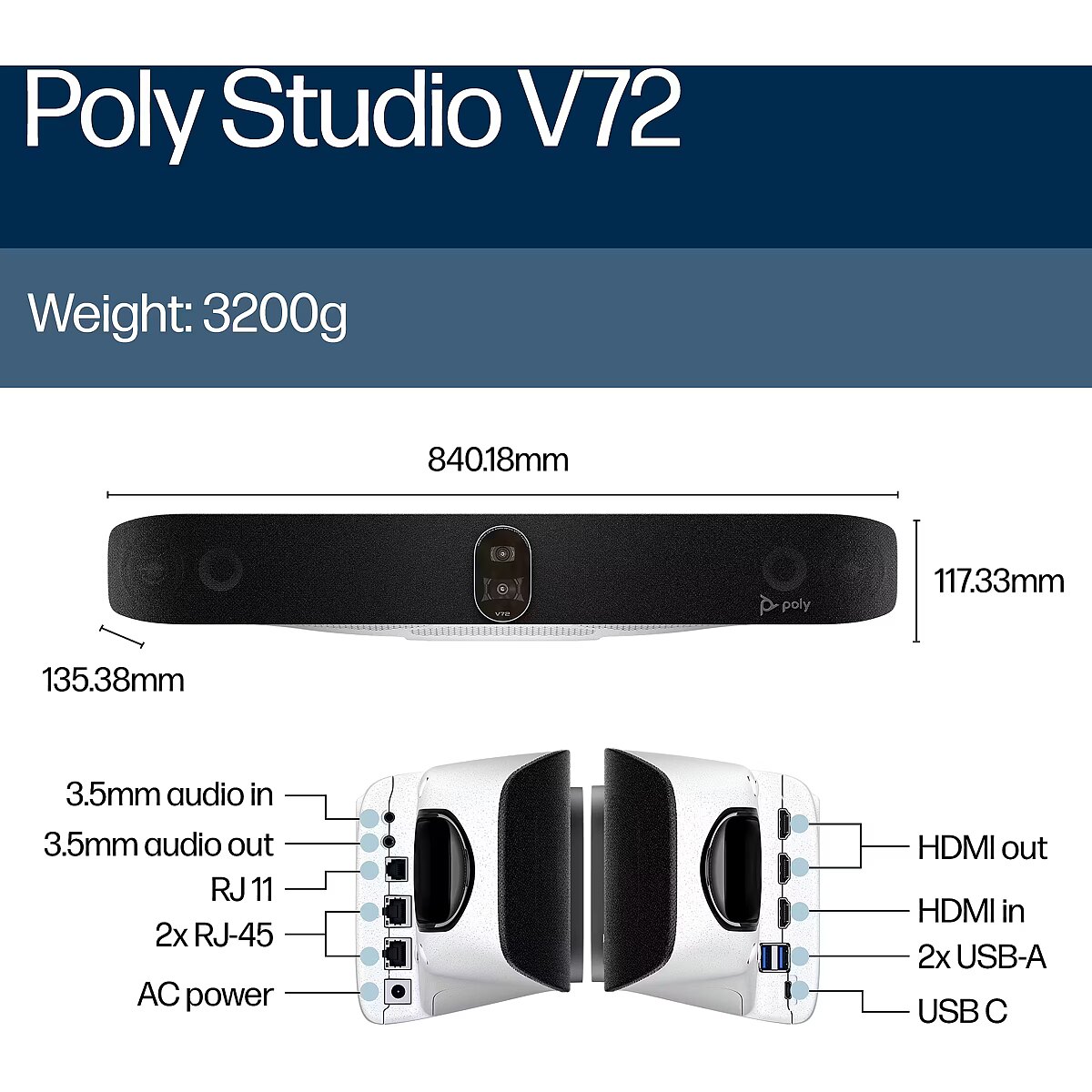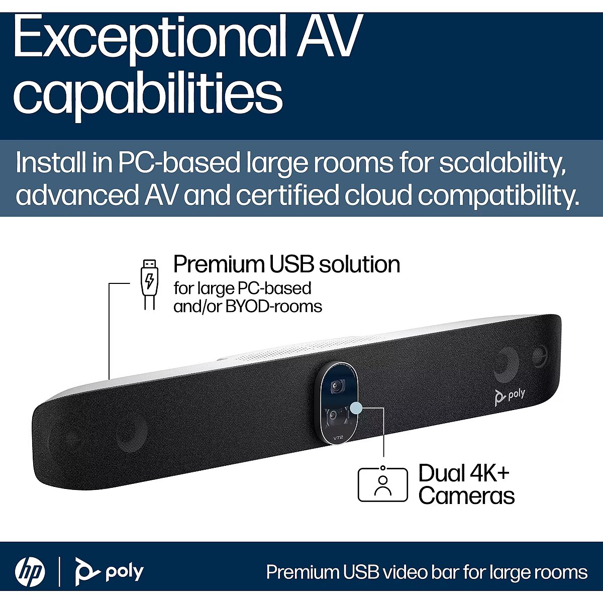 LongDesc - Exceptional AV capabilities. USB simplicityGet a deeper level of collaboration in large spaces with the Poly Studio V72 premium USB video bar. Simple and scalable, it's optimized for PC-based rooms, with Poly DirectorAI and NoiseBlockAI tech, and certified compatibility with major cloud video platforms.