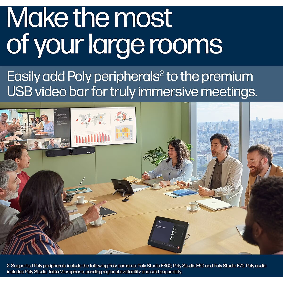 Stwórz idealne warunki do współpracy w dużych salach konferencyjnych. Łatwo podłącz dodatkowe kamery, mikrofony oraz inne akcesoria Poly do wideobara USB klasy premium, by każde spotkanie było naprawdę angażujące. Spójność to klucz do sukcesu.