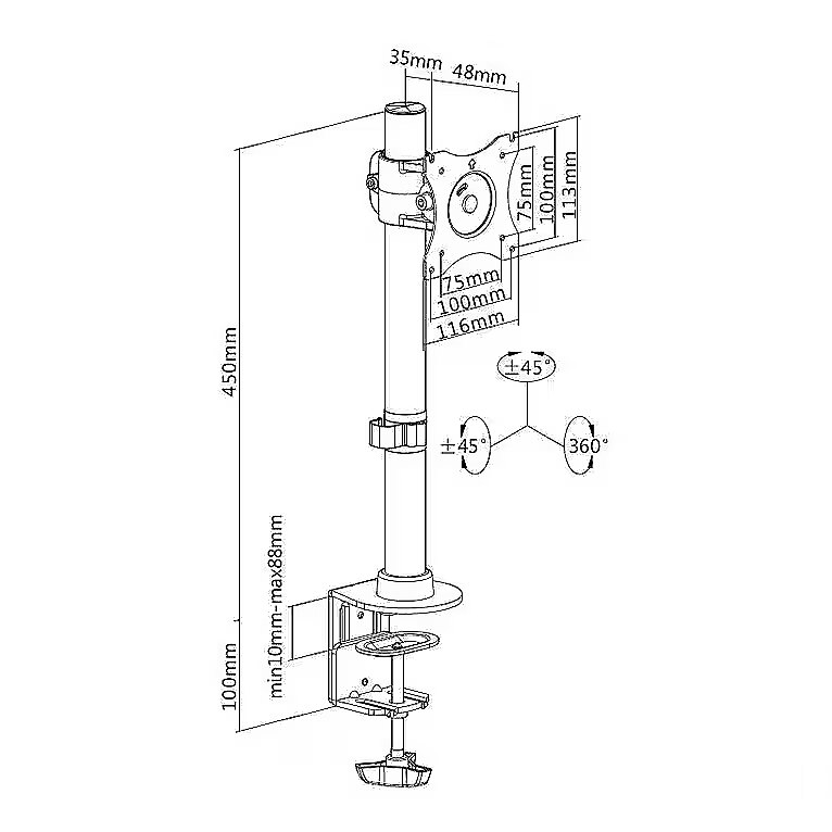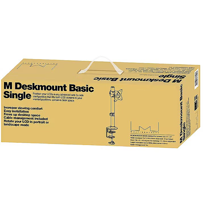 LongSummaryDescription - Multibrackets M Deskmount Basic Single. Maximum weight capacity: 10 kg, Minimum screen size: 38.1 cm (15"), Maximum screen size: 68.6 cm (27"), Minimum VESA mount: 75 x 75 mm, Maximum VESA mount: 100 x 100 mm. Height adjustment, Swivel angle range: -45 - 45°, Tilt angle range: -45 - 45°. Product colour: Black