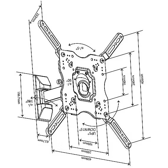 description_en - Robust steel flat sceen wall mount for up to 55" TVs. It can be tilted -15–5° and swinged ±90°. It can carry up to 35 kg. Set includes all fastening screws. Suitable screens: 55" / 140 cm VESA maximum: 400 × 400 VESA miinimum: 100 × 100 Maximum load: 35 kg Tilt angle: -15–5° (continuously adjustable) Swing radius: ±90° (continuously adjustable) Wall distance: 57–223 mm Integrated cable management Weight: 2.3 kg