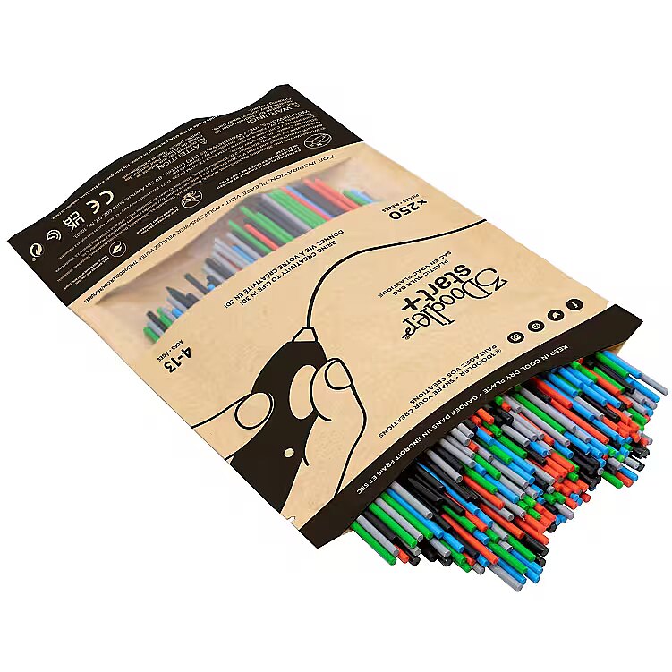LongDesc - Spare cartridges for the 3Doodler are a must-have to ensure the continued satisfaction of the 3D pen and the fun it guarantees to its owners. The set includes 250 pieces of additional EKO cartridges: Ocean Blue (Blue), Cherry Red (Red), Spring Green (Green), Koala Gray (Gray).Characteristics- The 3Doodler Start pen and dedicated ECO-refills have been specially designed to be completely safe for children- Eco-cartridges for 3Doodler Start are made of safe, non-toxic, BPA-free and completely biodegradable materials- The plastic that comes out of 3Doodler Start after melting is warm, but not hot. Therefore, after the insert slides out, the child can safely shape it with his handsTechnical data- Eco-insert length: 150mm- ECO-cartridge diameter: 2.5mm- Length of a single ECO-contribution after remelting: 1.5m- Package dimensions: 178x150x20mm- Package weight: 280g- Compatibility: 3Doodler Start- ECO-cartridges are not compatible with 3Doodler, versions PRO, Create Plus, Create, 2.0 and 1.03Doodler is one of those fantastic ideas that seem so obvious in retrospect that it is hard to believe that they are only now being implemented.The premise is simple: the 3Doodler Start pen draws with a heated ECO-cartridge, which makes it possible to build 3D objects in the same way as a 3D printer, but without creating computer models.The 3Doodler Start pen is extremely easy to use. To start creative play, just put the selected color of the ECO-insert in the guide and after a while your child can start creating. The only limitation is your own ingenuity.3Doodler Start means endless possibilities of long and creative fun for your child !!!
