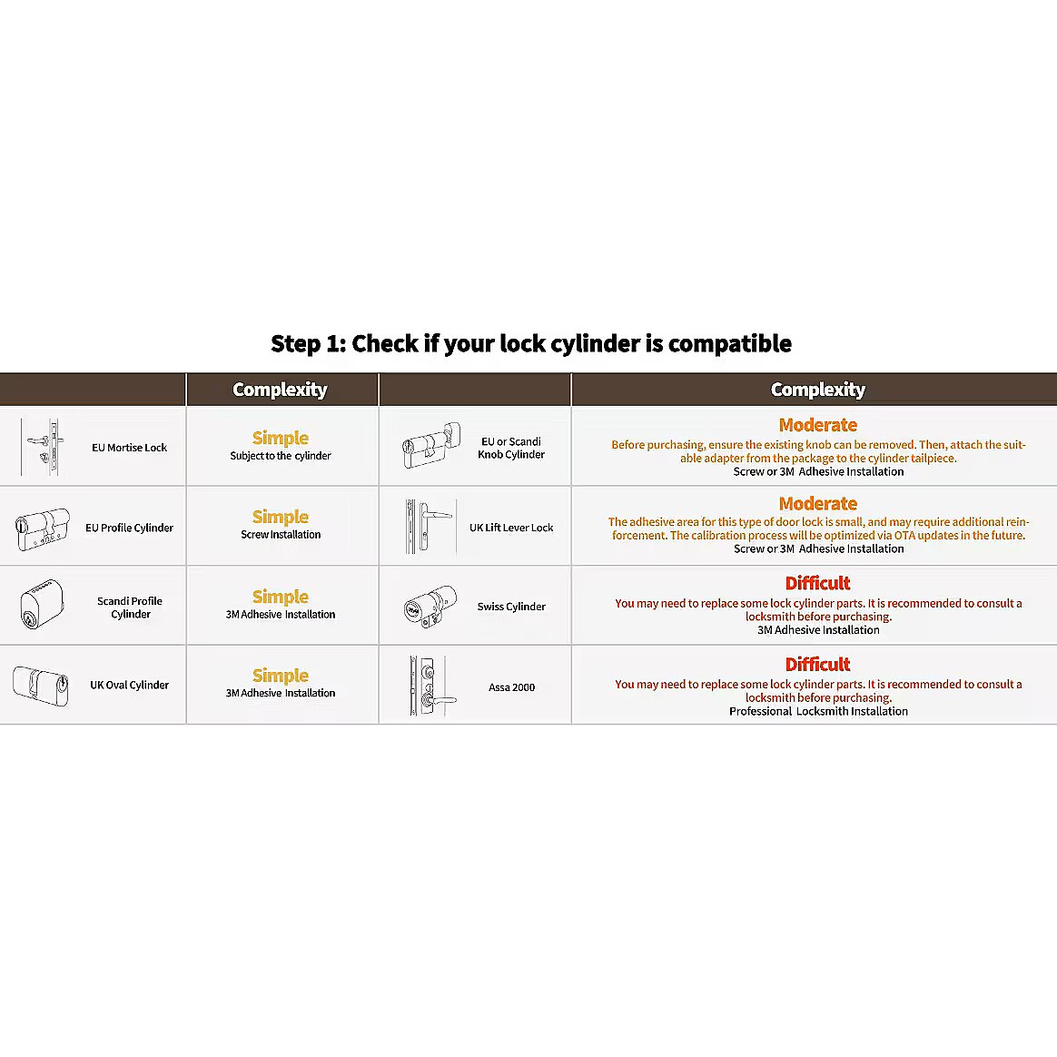 Installs without drilling or replacing the lock cylinder. Compatible with European and Scandinavian locks that support emergency function.