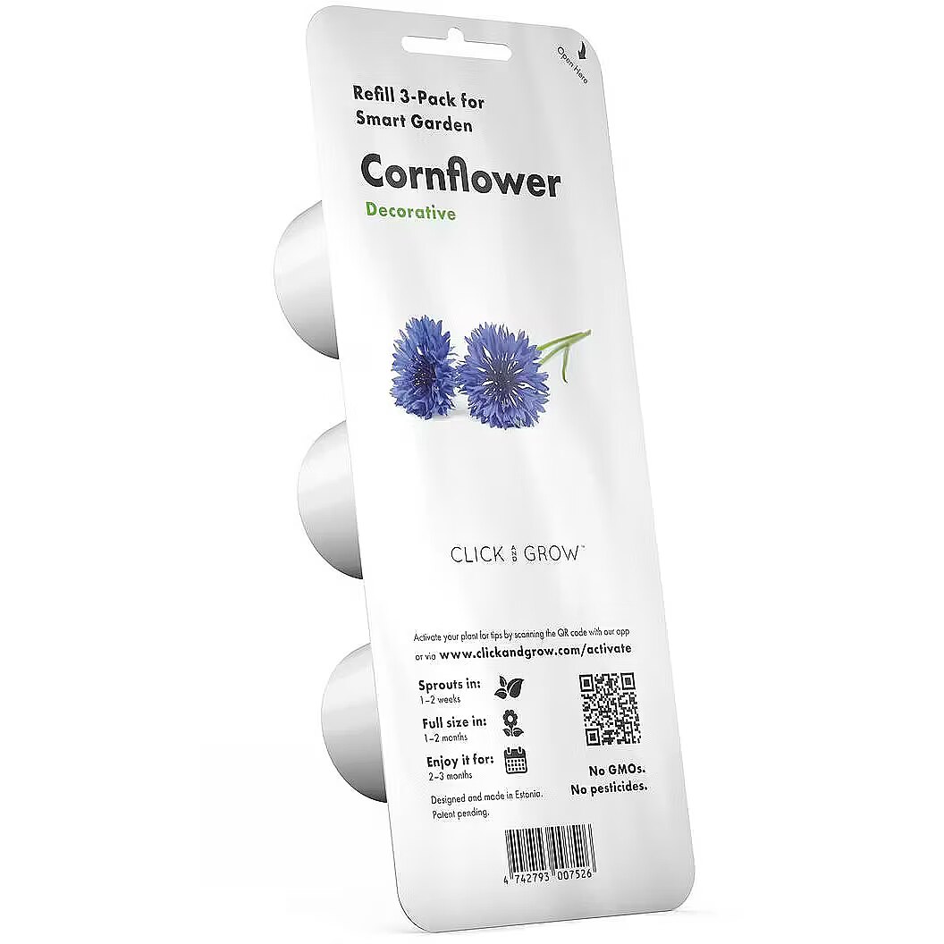 description_en - Cornflower boasts a rich and interesting history, being a national symbol of Estonia. Its shockingly blue flowers will spark up any home. Includes 3 cornflower seed plant capsules. This plant can be started year-round with adequate light conditions, sprouts in 1 to 2 weeks, grows to full size in 1 to 2 months and can live up to 2 to 3 months. Use the capsules only with a Click & Grow Smart Garden (sold separately). We're switching to a more sustainable plant capsule system, and you might receive your plant capsules without the plastic around the Smart Soil. This system works with the older Smart Herb Garden also, just don't throw away the plastic capsules!
