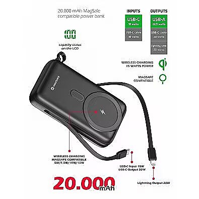 description_en - Are you looking for a power bank with which you no longer have to deal with any cables, and at the same time, it will have sufficient capacity? You found it right. Our Swissten power bank, which has both MagSafe wireless charging and integrated charging cables, will meet all your expectations. The power bank has a capacity of 20,000 mAh, so you won't have to worry if you will have enough capacity with you on your tours.