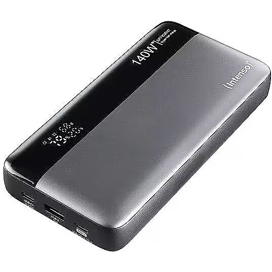 Description - Power Bank INTENSO HE25000 With up to 25000 mAh and 140 watts The Intenso power banks HE25000 are your perfect companions on the go when it comes to powerful and reliable energy supply. With an impressive capacity of 25,000 mAh respectively and a robust lithium-polymer battery, both power banks ensure that your devices are always ready for use. The smart, digital status display keeps you informed about the charge level of the power bank and the current charging/discharging power in volts and watts, so you’re never left in the dark. Maximum capacity. Maximum energy The Intenso HE25000 power banks enable extra-fast charging for compatible devices. With the versatile ports – including USB-A and two USB-C ports – you can optimally charge almost any device. The HE25000 even achieves an impressive output of up to 140 watts thanks to the USB-C2 port equipped with PD 3.1, supported by the supplied USB-C to USB-C cable with integrated E-marker chip. Charge your laptop in record time. With a variety of output options, the power banks adapt to your specific charging requirements. Safety and comfort. Even when travelling In addition to their impressive performance, the Intenso power banks also offer the highest level of safety. Thanks to over-voltage protection, discharge protection, overcharge protection, and short-circuit protection, your devices are always securely connected. The HE25000 power banks come with a practical bag that protects it from scratches and bumps, making it even easier to carry around. Whether travelling, at the office, or at home, with the Intenso power bank HE25000, you always have the necessary energy on hand to keep your digital companions ready to go.