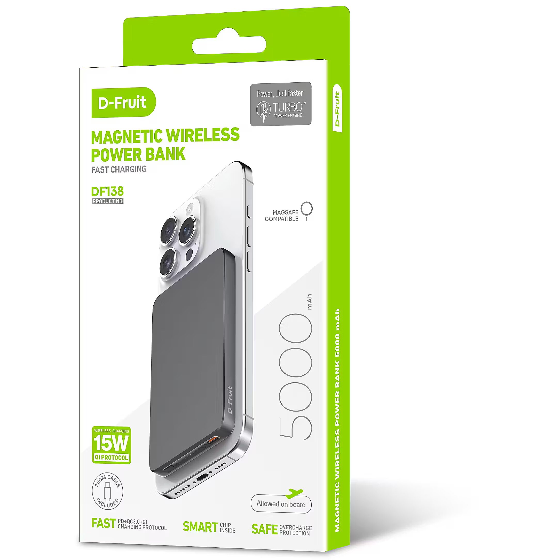 description_en - A power bank is an extremely convenient tool in the smart age. It allows you to charge not only your smartphone, but also Bluetooth headphones, tablets and other devices when you are away from a wall outlet. This way, you don't have to worry about whether the battery will last until the end of the day. With a power bank, you can leave your smart device charging at the bottom of your bag and happily carry on with your daily activities. The D-Fruit DF138 Wireless power bank is the ideal choice for those who value speed and convenience when charging smart devices. Thanks to MagSafe technology, you can also charge your smartphone wirelessly - with integrated magnets, the power bank attaches securely to the phone and starts charging it immediately. In addition, it also has a USB-C output, which also functions as an input port for charging the power bank. 5000 mAh capacity Maximum output power: 15 W Supports Power Delivery and Quick Charge 3.0 fast charging USB-C port can be used to charge both devices and the power bank itself Suitable for hand luggage and air travel Charging cable included