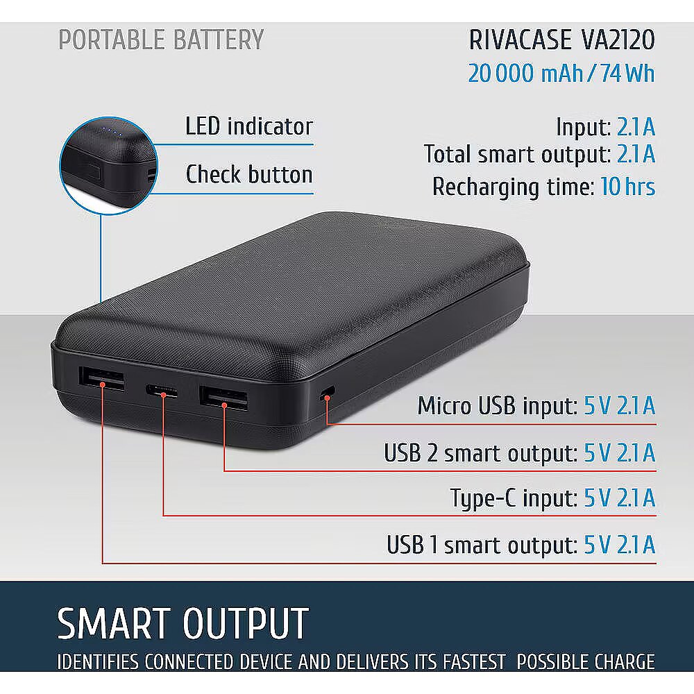 Description - RIVACASE VA2120 portable rechargeable battery 20000 mAh Product Features: • 20000 mAh capacity rechargeable Li-Pol battery. • Compatible with all popular models of smartphones, Tablets and other mobile devices. • Protection for over-charging, over-discharging, overload and short circuit. • Automatic turn on/off. Just plug your device(s) into RIVACASE battery output socket(s) and the charging will start. • To check the battery status, press the button on the battery body. 4 LED indicators will show the remaining power. • Smartphone charging - up to 8 times. Tablet charging - up to 4 times. • Cable included KEY FEATURE: • SMART OUTPUT - battery detects connected device and select fastest possible charging mode • Type-C Input • Pass through charging Specification: Li-Pol battery: 3.7V 20000 mAh 74 Wh. 1. Input 1: micro USB 5.0V/2.1A 2. Input 2: Type-C 5.0V 2.1A 3. Output 1: USB 5.0V/2.1A 4. Output 2: USB 5.0V/2.1A 5. Total output current : 2.1A Size: 138x68x28 mm Weight: 410 g.