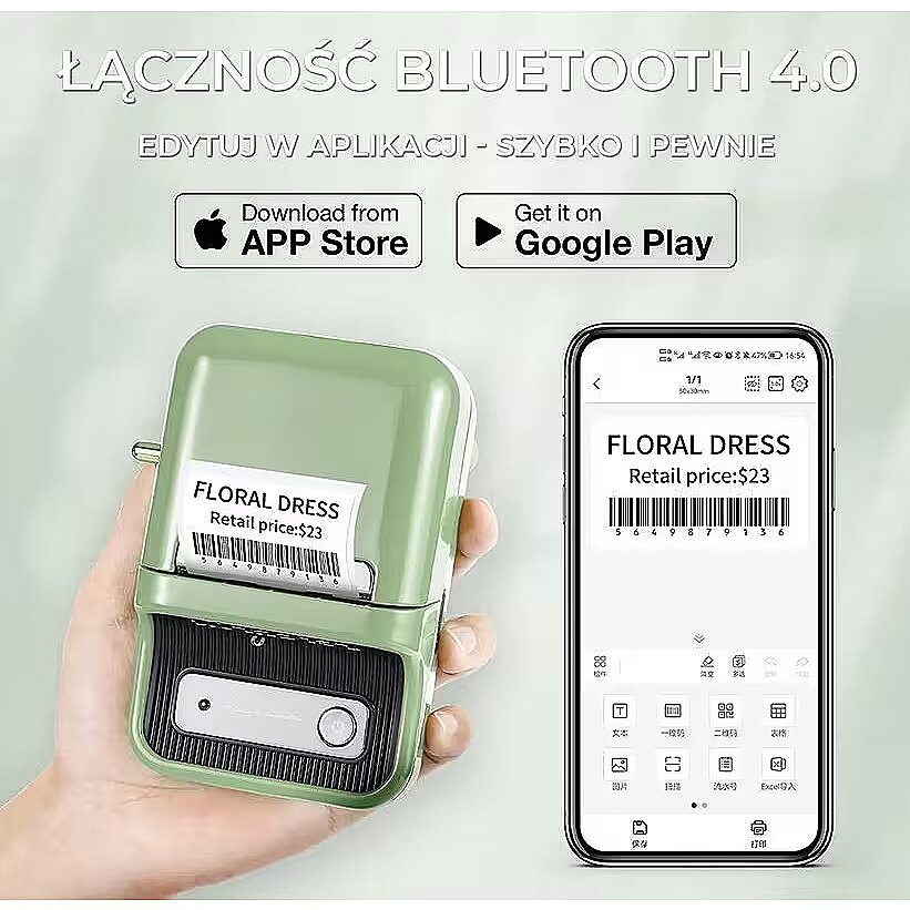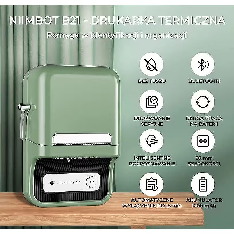 Description - NIIMBOT B21S GREEN Portable thermal label printer for home, office and small business users Niimbot is a portable thermal printer that allows you to wirelessly print stickers anywhere in the world thanks to its built-in 1200mAh battery. The printer comes with simple and free iOS and Android apps that make it easy to create stickers with different elements such as text, barcodes, QR codes, images and much more. You will receive the Niimbot B21 printer, a 50x30 mm label starter roll, a charging cable and a user manual in Polish. Rolls for the printer are available in our shop. The printer supports rolls up to 50 mm wide and can also print on ordinary thermal paper. Printing width: up to 50 mm Types of labels: plain, thermal, self-adhesive, paper, foil Barcode types: EAN8, EAN13, CODE39, CODE128, ITF, CODABAR, QR, PDF417 Connectivity: USB-C, Bluetooth Supported operating systems: Windows, Mac, Android Built-in 1200 mAh lithium-ion battery Free app (Windows, Apple and Android) Set includes 1 roll of labels Additional label rolls and transparent label rolls are available separately. Here is a list of the functions available in the app: Create stickers with multiple elements such as camera images, QR codes and others that generate automatically, lines and other shapes, emoticons and pre-made logos, as well as the current time and date. Entering text in the font, size and number of lines of your choice. Addition of Excel tables and images. Generation of barcodes, e.g. EAN-13 or your own product code. Printing of serially numbered labels. Scanning and printing of code