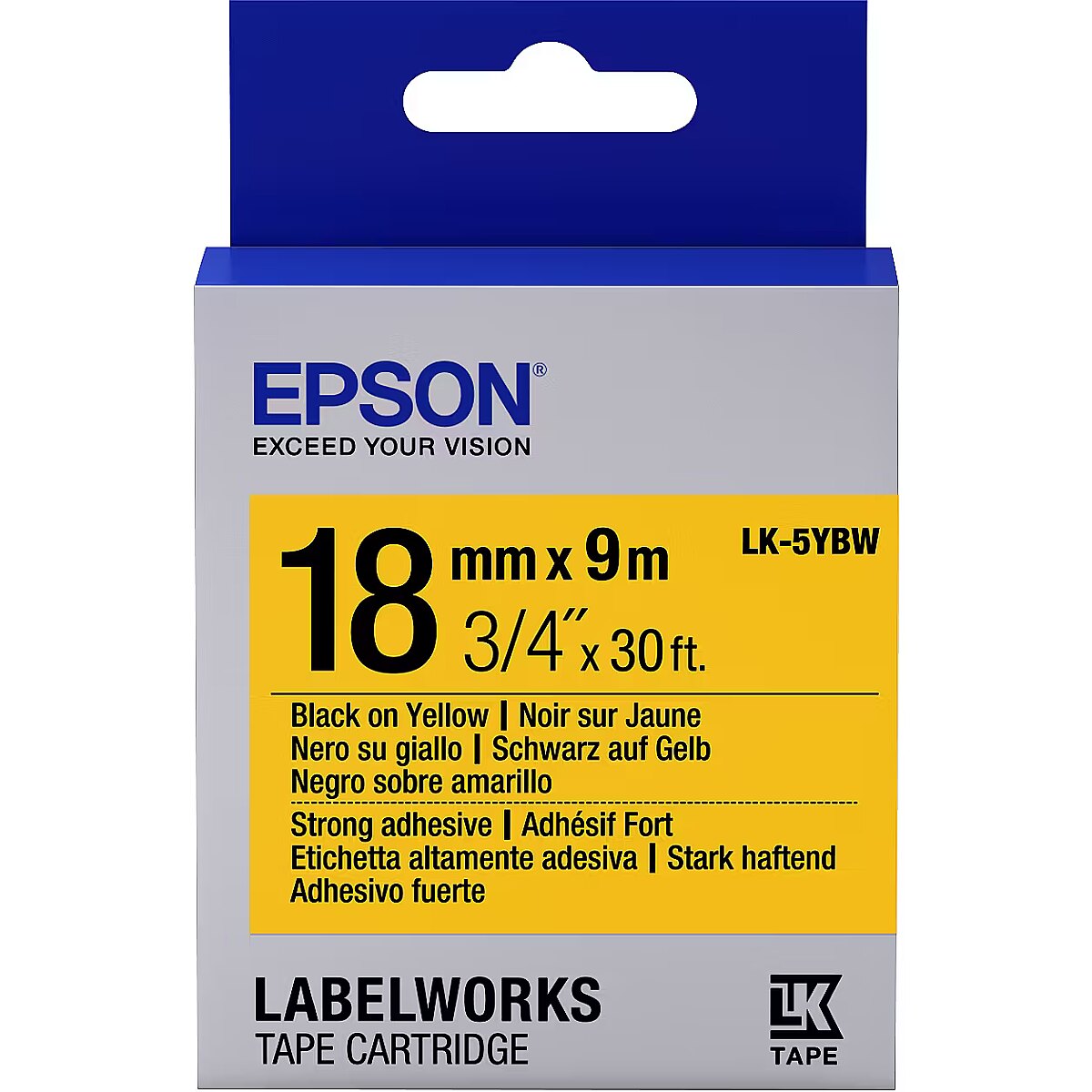 ShortSummaryDescription - Epson Label Cartridge Strong Adhesive LK-5YBW Black/Yellow 18mm (9m), Black on yellow, Japan, LabelWorks LW-1000P LabelWorks LW-400 LabelWorks LW-400VP LabelWorks LW-600P LabelWorks LW-700..., 1.8 cm, 9 m, 1 pc(s)