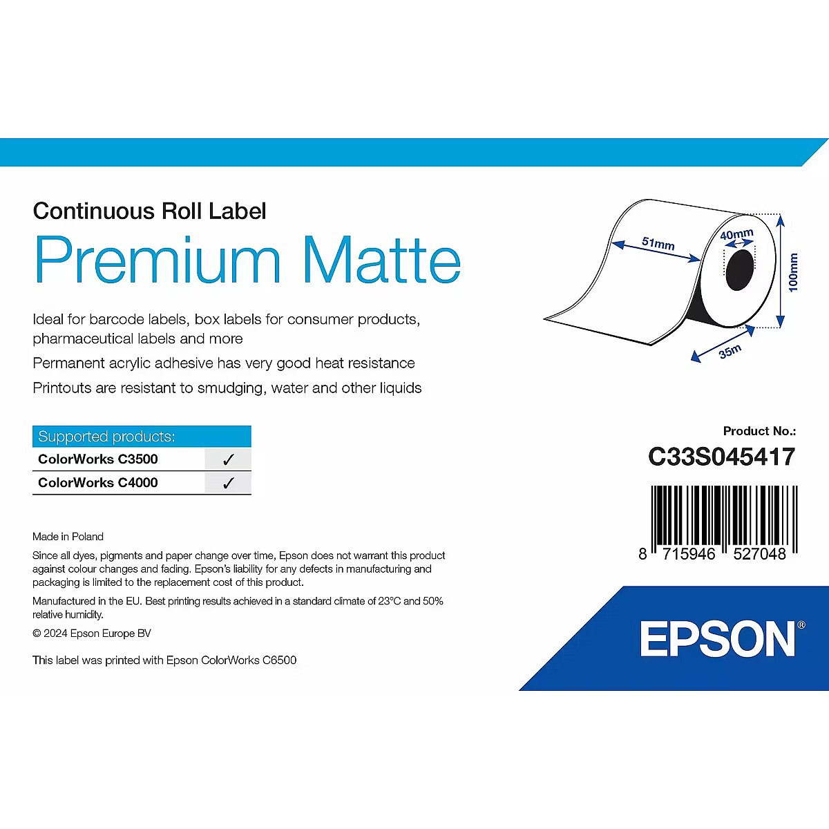 LongSummaryDescription - Epson Premium Matte Label - Continuous Roll: 51mm x 35m. Finish type: Matte, Print media weight: 163 g/m². Quantity per pack: 1 pc(s), Package width: 118 mm, Package depth: 108 mm. Products per pallet: 792 pc(s), Pallet gross length: 120 cm, Pallet gross width: 80 cm. Country of origin: Poland