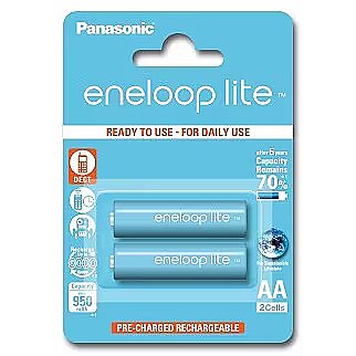 description_en - eneloop lite. Ideal for low-to-medium power consumption devices. The eneloop lite rechargeable battery is ideal for low-to-medium power consumption devices, such as DECT phones and remote controls. eneloop lite has all the advantages of the classical eneloop: The rechargeable batteries are pre-charged and therefore ready to use right after being purchased. Because of its low self discharge eneloop lite retains 70% of its initial charge even after 3 years of storage. The differences between eneloop lite and the classical eneloop become visible when comparing capacity and cycle life. Rechargeable up to 3000 times eneloop lite is rechargeable up to 3000 times, which makes it even more economically and environment-friendly. By reducing the amount of materials used, attractive prices have been realized. Faster charging The reduced capacity also leads to a faster charging. Compared to the charging time of a eneloop battery size mignon, that of an eneloop lite size mignon is only half. Available as AA and AAA eneloop lite is available in sizes mignon (AA) and micro (AAA) . Both types have a nominal voltage of 1,2V and a minimum capacity of 950 mAh (AA) and 550 mAh (AAA). Lite means lighter The eneloop lite has less weight than the eneloop. For example: a eneloop lite size mignon weighs approximately 19g which is about 30% less than a eneloop size mignon (approx. 27g). Lighter batteries are especially convenient for devices that use multiple batteries and when many batteries need to be carried.