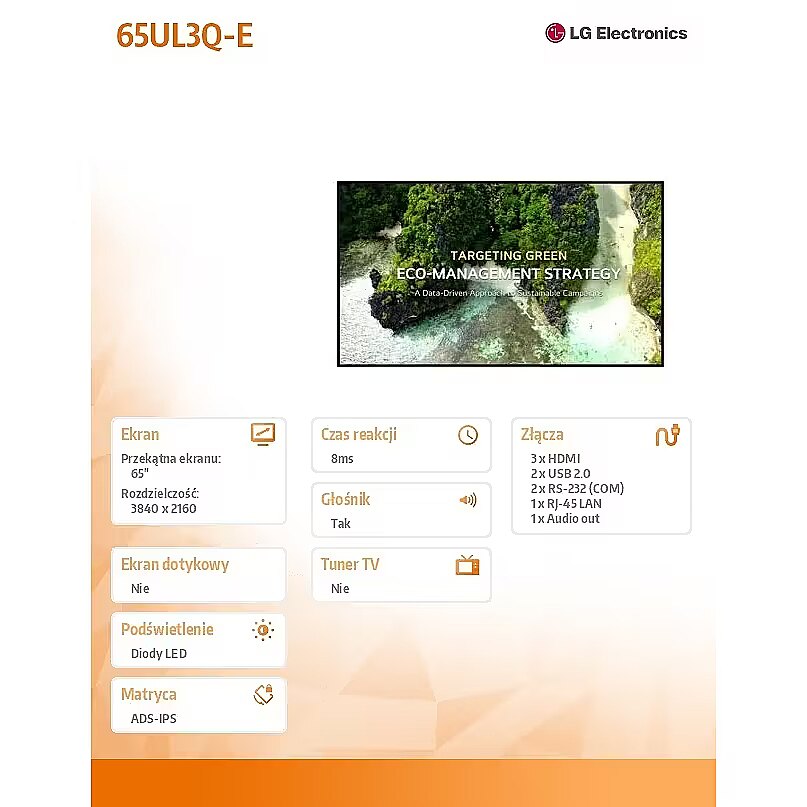 Description - Doskonała jakość obrazu w rozdzielczości Ultra HD Dzięki rozdzielczości UHD sprawia, że kolory i szczegóły treści są żywe i realistyczne. Ponadto szeroki kąt widzenia zapewnia wyraźną treść. Wysoka wydajność dzięki LG webOS 6.1 LG webOS 6.1 jest dostępny w serii UL3Q w celu płynnego wykonywania wielu zadań. Platforma smart signage LG webOS zwiększa wygodę użytkownika dzięki intuicyjnemu graficznemu interfejsowi użytkownika. Łatwa instalacja dzięki jednolitej konstrukcji ramki Seria UL3Q charakteryzuje się doskonale wyważonymi ramkami poziomymi i pionowymi, tworząc wizualnie harmonijne rozwiązanie wyświetlacza. Jego specjalistyczna konstrukcja upraszcza instalację w środowiskach handlowych, zapewniając jednocześnie naprawdę wciągające wrażenia wizualne. Wyrafinowane, symetryczne ramki zwiększają estetykę każdej przestrzeni, przekształcając zwykłe wyświetlacze w eleganckie punkty centralne. Adaptacyjne środowisko wyświetlania Doświadcz zwiększonej elastyczności dzięki innowacyjnemu wspornikowi pochylania Face Up/Down UL3Q. Niezależnie od tego, czy jest zamontowany wysoko, czy nisko, każdy wyświetlacz można dostosować tak, aby lepiej spotykał się z widzami na poziomie oczu, promując maksymalne zaangażowanie niezależnie od wysokości instalacji. Ta wszechstronność optymalizuje zarówno wydajność przestrzenną, jak i komfort wizualny, dostarczając wyraźnych informacji pod różnymi kątami widzenia. Zdalne monitorowanie i sterowanie To internetowe rozwiązanie do monitorowania jest przyjazne dla użytkownika i pozwala użytkownikowi czuć się swobodnie. Umożliwia użytkownikowi pełny dostęp w dowolnym miejscu i czasie z telefonu komórkowego i komputera w środowisku dostępnym w sieci, mając jednocześnie dostęp zarówno do bieżących, jak i przeszłych danych. Pozwala użytkownikowi monitorować urządzenie, dokonywać regulacji i zdalnie sterować urządzeniem w czasie rzeczywistym. Wbudowany czujnik jasności Zamontowany z przodu czujnik UL3Q automatycznie dostosowuje jasność do różnych warunków oświetleniowych, pomagając zoptymalizować jakość oglądania i efektywność energetyczną bez konieczności ręcznej interwencji. Ta adaptacyjna funkcja pomaga utrzymać stałą wydajność wyświetlacza, jednocześnie wspierając oszczędzanie energii, zapewniając lepsze wrażenia wizualne, które reagują na zmiany otoczenia. Zaawansowana architektura zabezpieczeń UL3Q wykorzystuje technologię LG Enhanced Kernel Protection (EKP), chroniącą krytyczne dane przed nieautoryzowanym dostępem i potencjalnymi zagrożeniami bezpieczeństwa. To zaangażowanie w bezpieczeństwo informacji jest potwierdzone certyfikatem ISO/IEC 15408 Common Criteria EAL2, który daje firmom pewność, że ich wrażliwe treści i operacje pozostają chronione w dzisiejszym wymagającym krajobrazie bezpieczeństwa. Wielokrotnie nagradzany zrównoważony rozwój Seria UL3Q ucieleśnia zaangażowanie LG Display w ESG: "Lepsze życie dla wszystkich". To zaangażowanie całej firmy w odpowiedzialność za środowisko przyniosło prestiżowy platynowy medal EcoVadis 2025, plasując nas wśród 1% najlepszych firm na świecie pod względem doskonałości w zakresie zrównoważonego rozwoju. LG ConnectedCare Konserwacja jest łatwa i szybka dzięki opcjonalnej usłudze LG ConnectedCare, rozwiązaniu w chmurze dostarczanemu przez firmę LG. Zdalnie zarządza stanem wyświetlaczy na stanowiskach pracy klienta w celu diagnozowania usterek i usług zdalnego sterowania, wspierając stabilne działanie firm klientów.