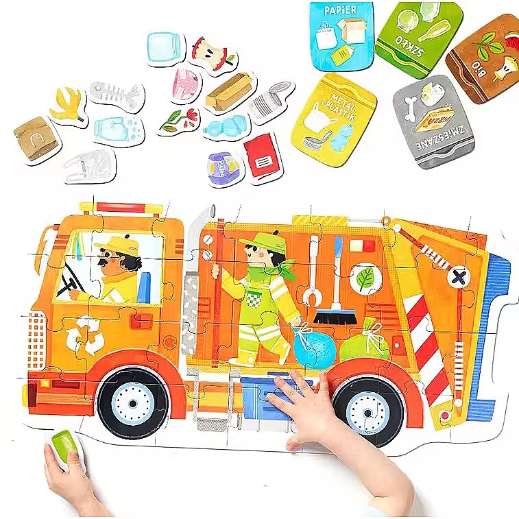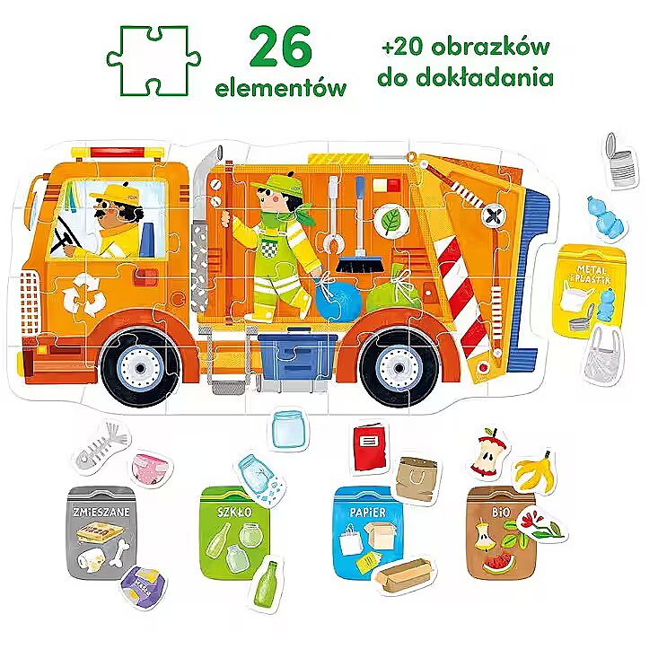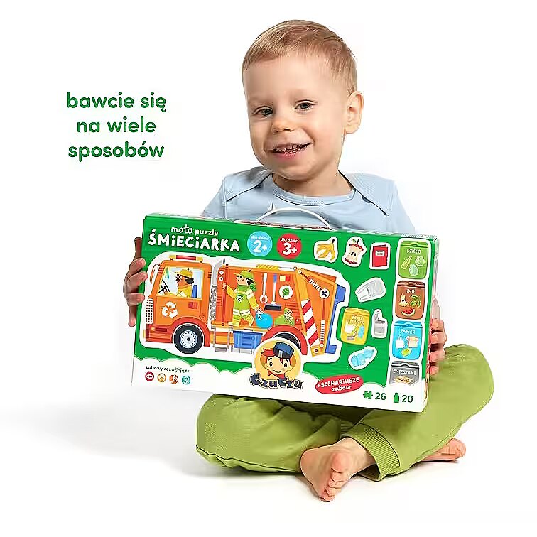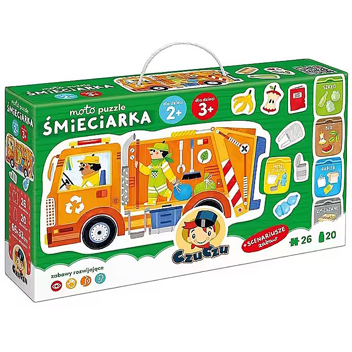 Description - Moto puzzle Śmieciarka to wyjątkowy zestaw edukacyjny dla ciekawych świata odkrywców. W prezentowym pudełku znajdziecie duży puzzlowy wóz składający się z 26 elementów i dodatkowe obrazki do dokładania: 5 kontenerów i 15 śmieci. Wspaniała śmieciarka i ciekawa tematyka inspiruje do mnóstwa kreatywnych zabaw i pozwala na wesoło poznawać zasady segregacji śmieci i ekologii. Do zestawu dołączyliśmy poradnik pełen pomysłów na zabawy, oto niektóre z nich: Ułóżcie puzzle ze śmieciarką Ta przyjemna zabawa fantastycznie rozwija mała motorykę, spostrzegawczość i logiczne myślenie. Poznajcie zasady segregacji śmieci Pierwsza lekcja ekologii na wesoło! Zobaczcie, do czego służą kontenery o różnych kolorach. Zorientujcie się, czym różnią się od siebie różne śmieci, i co gdzie się wyrzuca i dlaczego? Nazywajcie to, co widzicie na ilustracji To doskonały sposób na poszerzanie słownictwa, także w obcym języku. Narysujcie własną śmieciarkę i jeszcze więcej śmieci. Pamiętajcie, by segregować śmieci na co dzień! Zabawa start!