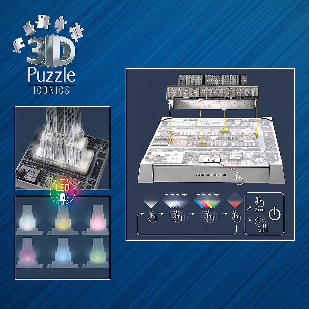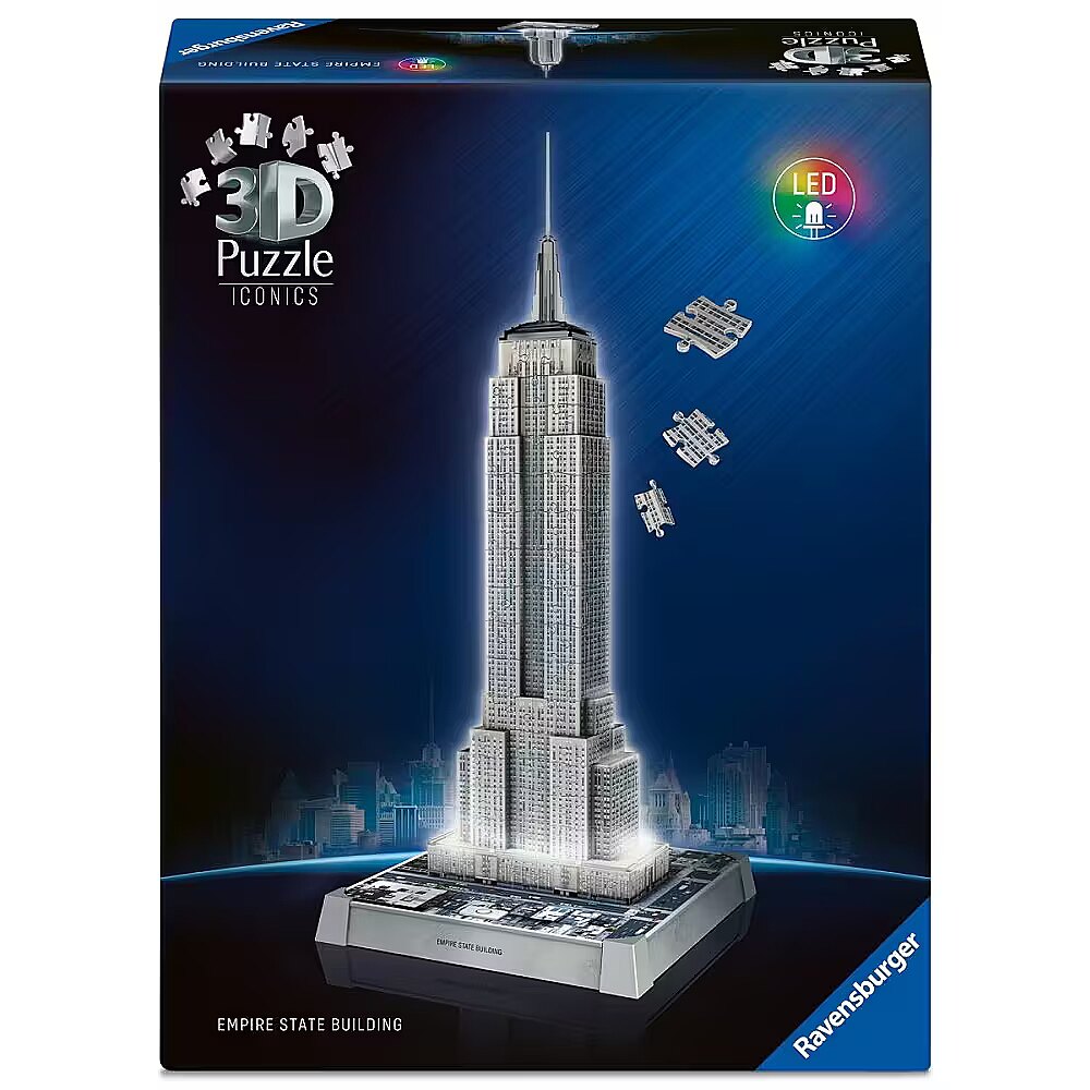 Description - Puzzle 3D Empire State Building Tak ekscytujące - tak relaksujące - tak oryginalne! Twórz wyjątkowe konstrukcje 3D z puzzlami 3D od firmy Ravensburger! Odkryj nowy, trójwymiarowy sposób układania puzzli. Elementy tych puzzli zostały wykonane ze sztywnego tworzywa sztucznego, które pozwala na utrzymanie się konstrukcji bez użycia kleju. Ułożone przedmioty nie rozwarstwiają się, a puzzle mocno trzymają się siebie. Materiał użyty do produkcji klocków jest łatwy w czyszczeniu, wystarczy użyć wilgotnej szmatki. Empire State Building to coś dla miłośników architektury. Konstrukcja z puzzli 3d to wiernie odwzorowana budowla, którą możesz trzymać u siebie w domu. W zestawie oprócz puzzli znajdziesz również podstawkę.