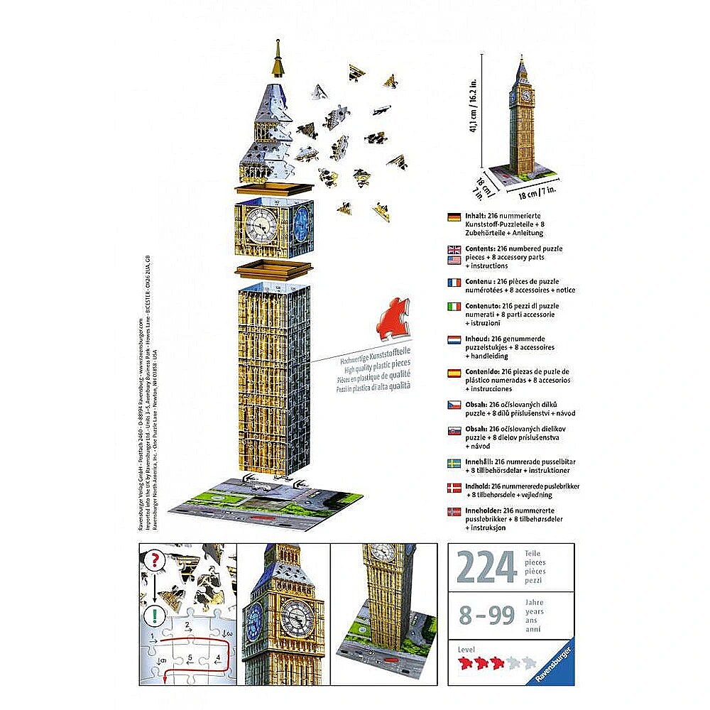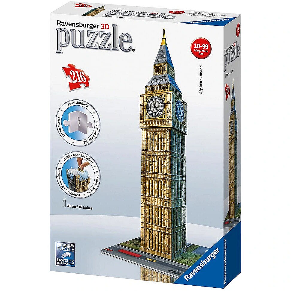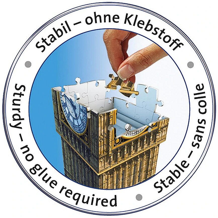 Description - W nowej koncepcji puzzli Ravensburger 3D wykorzystano najnowszą niemiecką technologię stosowaną przy produkcji puzzli! W tej układance zastosowano niepowtarzalne elementy zawiasowe z tworzywa sztucznego, które po połączeniu tworzą ten solidny i wytrzymały budynek. Bez użycia kleju! Układanka składa się 216 wysokiej jakości plastikowych elementów i po złożeniu ma 41 cm. Na odwrotnej stronie każdego elementu układanki nadrukowany jest numer, dzięki czemu można złożyć układankę albo przez dopasowanie wzoru na oko lub po prostu według kolejnych liczb. W zestawie puzzli znajduje się drukowana płyta podstawki, dzięki czemu model można ładnie wyeksponować na półce lub blacie stołu. Jeden z najsłynniejszych budynków świata może być ozdobą twojego domu!