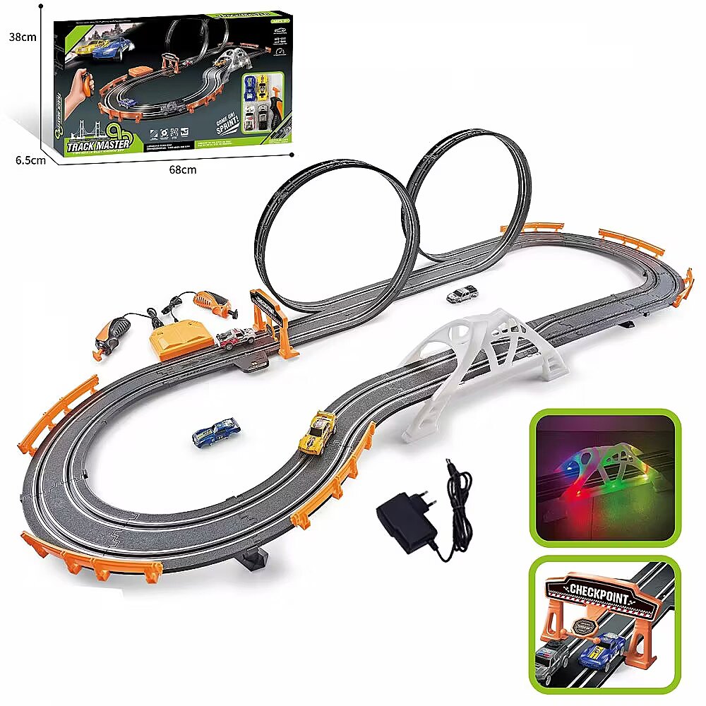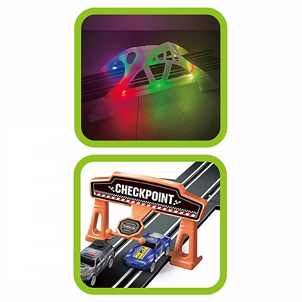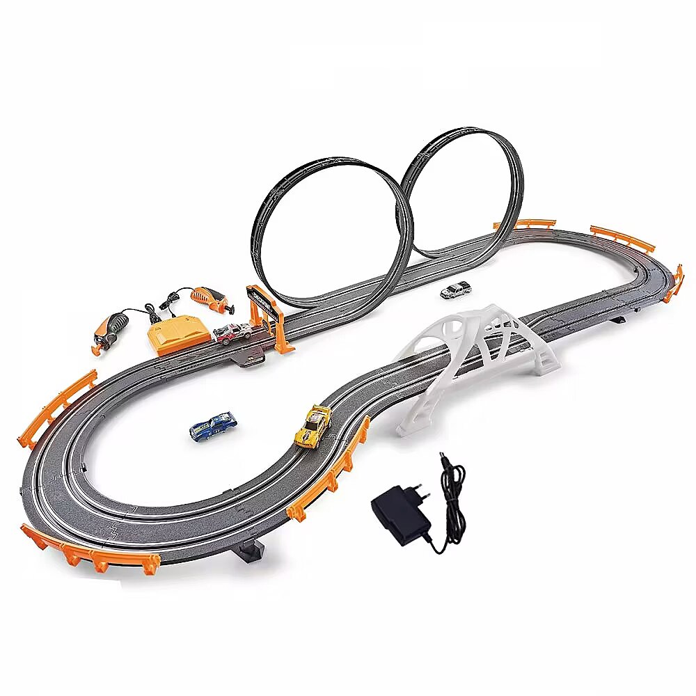 Description - This extraordinary 1:64 scale race track is the perfect choice for both young and old fans of automotive excitement. It features two loops and a lit-up bridge, making races even more thrilling. The set includes 2 cars with interchangeable bodies, allowing you to customize the vehicles to suit your preferences. With a track length of 520 cm, it guarantees dynamic and exhilarating fun that will leave a lasting impression on every player. Made from high-quality plastic, the track ensures durability and stability during intense races. Designed for children aged 6 and up, its design is sure to appeal to young boys.