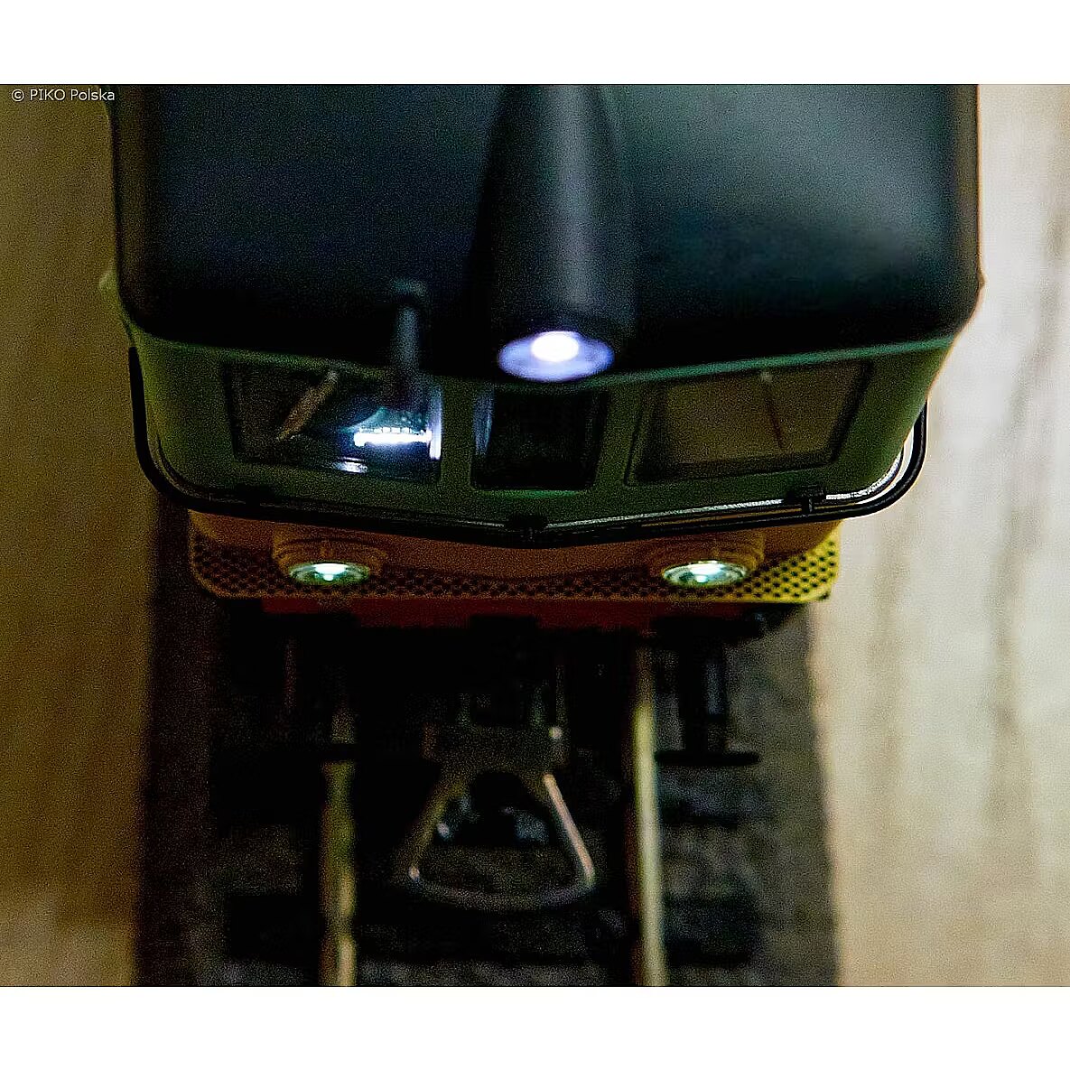 Other features - Rodzaj pomiaru: długość nad buforem Minimalny promień: 358 Interfejs cyfrowy: NEM 658 PluX22 Oświetlenie wewnętrzne/oświetlenie: przełączane cyfrowo oświetlenie kabiny (z dekoderem PluX22) Sprzęgło: wał NEM + łącznik zamknięty Dźwięk: Dekoder dźwięku PIKO można doposażyć #56589 Światła kierunkowe: światło zmienia się na biało/czerwone w zależności od kierunku jazdy Cechy szczególne: Oświetlenie pulpitu kierowcy