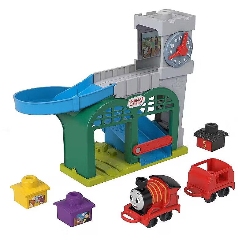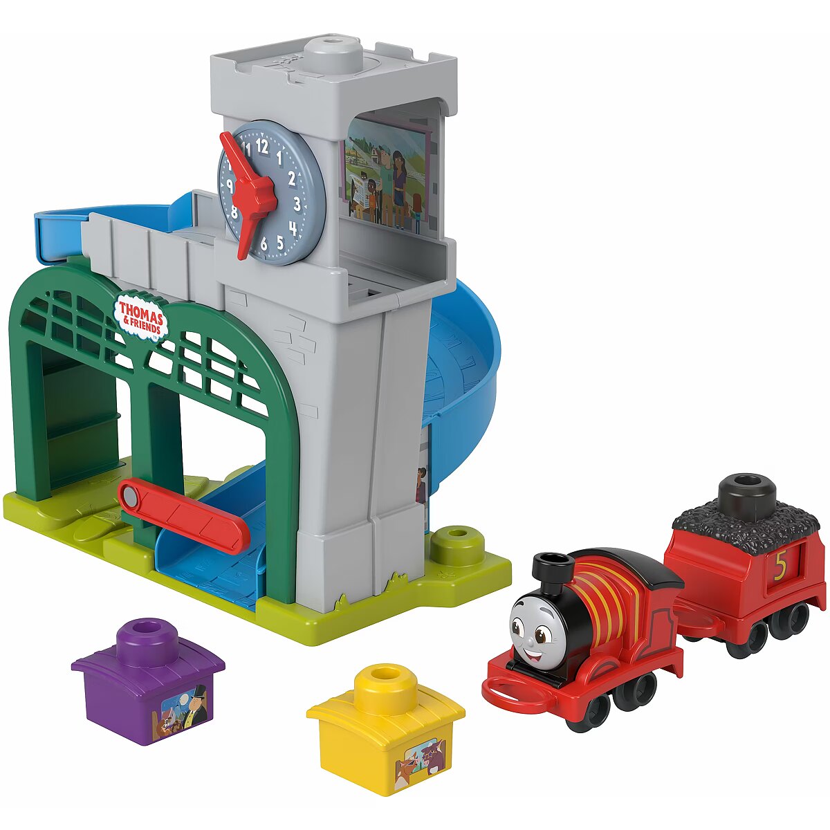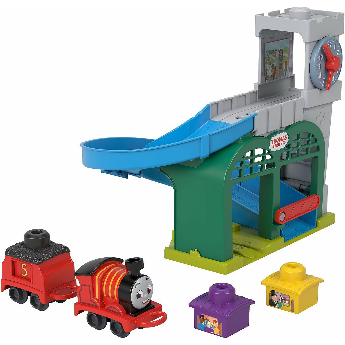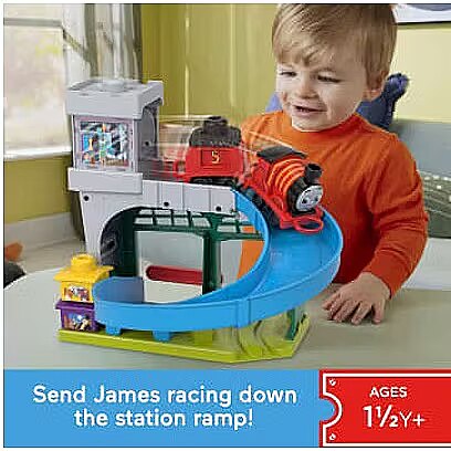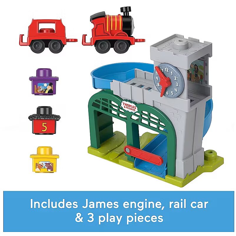 LongDesc - Toddlers can bring to life all the exciting hustle & bustle action of Sodor’s train station with this Thomas & Friends My First Knapford Station playset from Fisher-Price. Styled like the iconic location from Thomas & Friends: All Engines Go, this playset features a fun winding ramp for engines to zoom down, a drive-thru tunnel, and 3 pieces of cargo for kids to load and unload from James’ rail car. For added hands-on play, toddlers can spin the hands on the clock and lift & lower the ramp gate to keep James rolling along. Look for additional Thomas & Friends My First engines to bring to this playset for more toddler-friendly train play! (Additional engines sold separately and subject to availability.) Colours and decorations may vary.