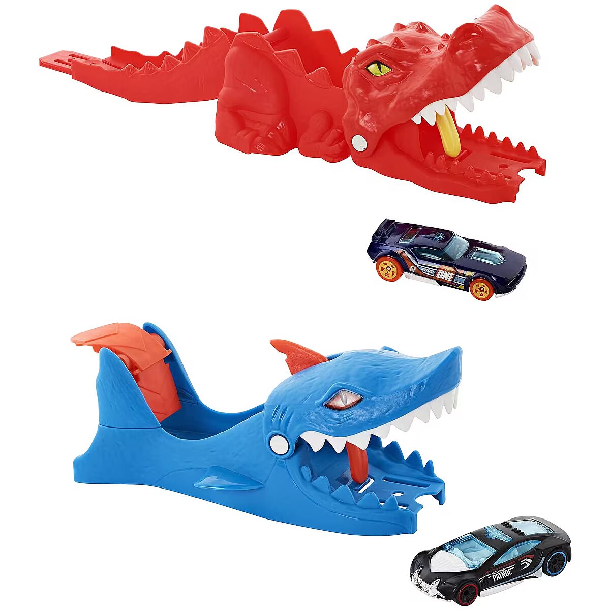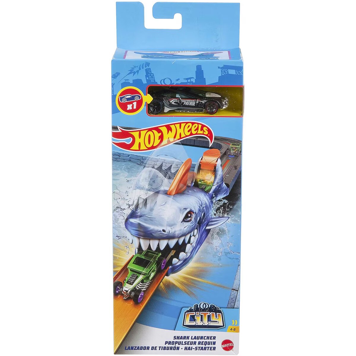 LongDesc - The Hot Wheels City Nemesis Launcher Assortment features two kid-favourite nemeses -- the T-rex and shark -- as super-cool car launchers (sold separately). Both the Hot Wheels Dino Launcher and the Hot Wheels Shark Launcher feature cool challenges where kids must launch cars with the right force or risk getting stuck in the nemeses' jaws. These compact toys can also be played with on their own for big-sized fun on a smaller scale. Each includes one 1:64 scale Hot Wheels car and are exciting gifts for kids four to eight years old. Each sold separately, subject to availability. Colours and decorations may vary.