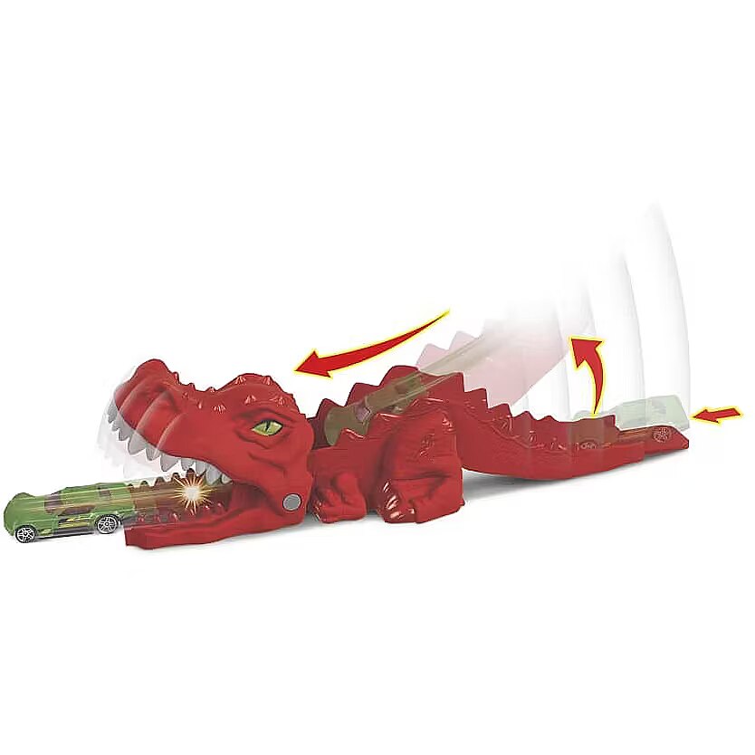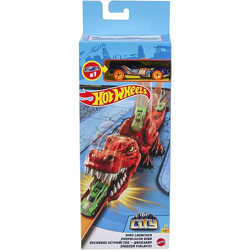 Description - T-Rex - as an epic vehicle launcher. The dinosaur launcher presents children with an incredible challenge - you have to release the car with enough force to avoid getting stuck in the creature's jaws. They can be combined with other sets, but on their own they also provide plenty of rallying excitement. The set contains one 1:64 scale Hot Wheels car and provides unique fun for children aged 4 to 8 years. Colours and decorative elements may vary. The Hot Wheels dinosaur launcher provides plenty of rallying excitement. It is perfect for combining with other Hot Wheels City sets (sold separately). Launch the cars with enough force to avoid getting stuck in the jaws of the beast! The launcher has two connection points so children can expand their Hot Wheels City world (other sets sold separately), adding more challenges and variety to their sets. Each set can also be played with on its own, without combining it with others. The Hot Wheels dinosaur launcher has a movable tail. One Hot Wheels car is included with the launcher. This is a great gift for children aged 4 to 8 who are just entering the world of Hot Wheels City, and those looking for a new challenge to combine with existing sets (sold separately).