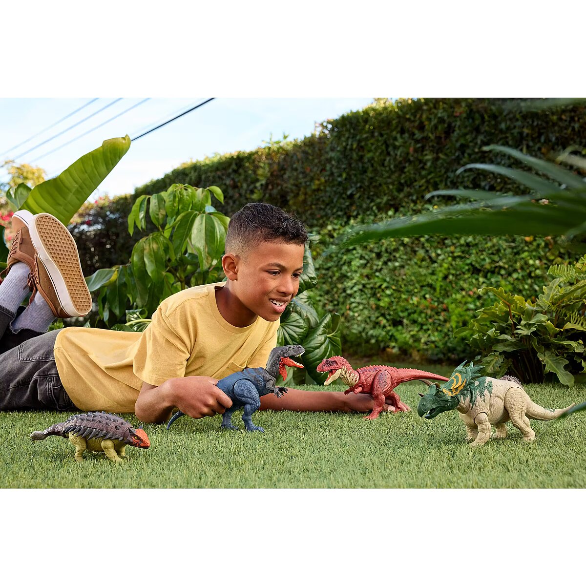 LongDesc - Get roaring and ferocious with this Wild Roar Baryonyx inspired by Jurassic World Rebirth. It's a Total Attack kids can easily move the tail up and down on this dinosaur toy to activate a thrilling attack motion, accompanied by a savage roar, then twist the tail to change the direction for thrilling battle play! This 13-inch long movie-inspired figure has movable joints, ready for exciting play or display. Scan the Tracking Code on the dinosaur's foot in the free Jurassic World Play App with a compatible smart device (Android or iOS, not included) to unlock a digital version of the dinosaur and play the fiercely fun game to race various vehicles on land, air and sea. The Baryonyx makes a great gift for dinosaur fans ages 4 years and up. Colours and decorations may vary.