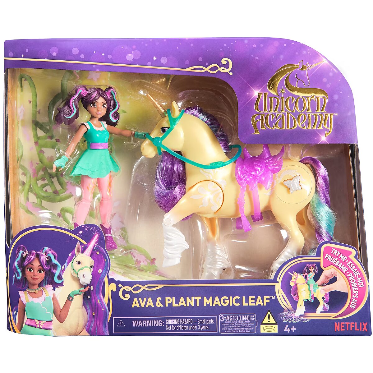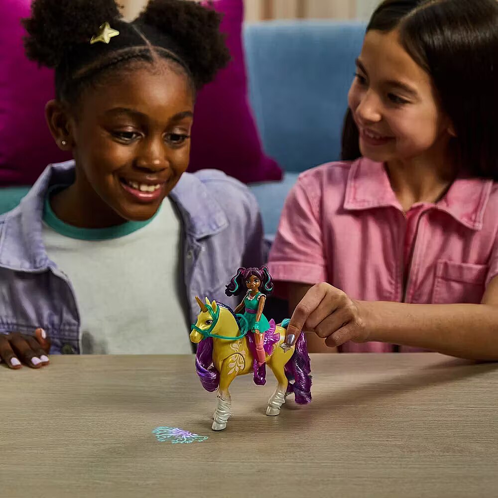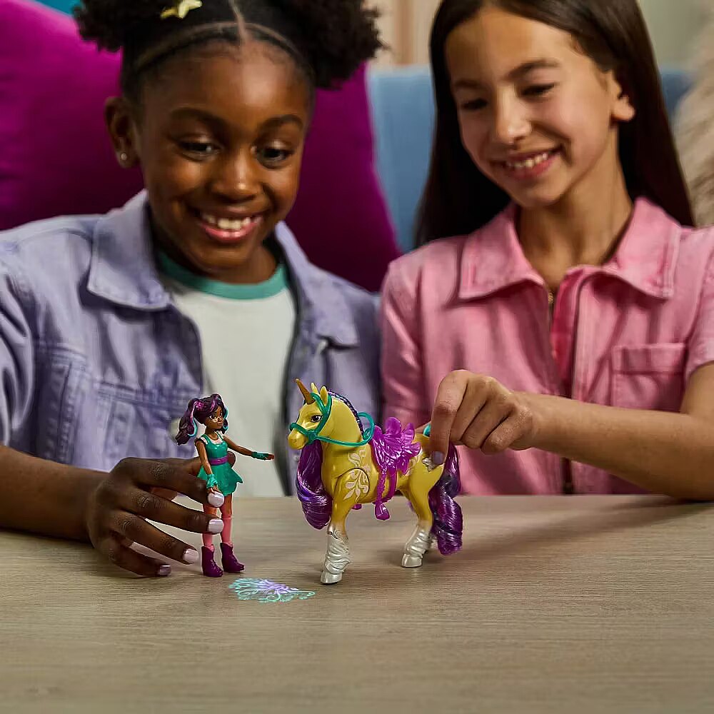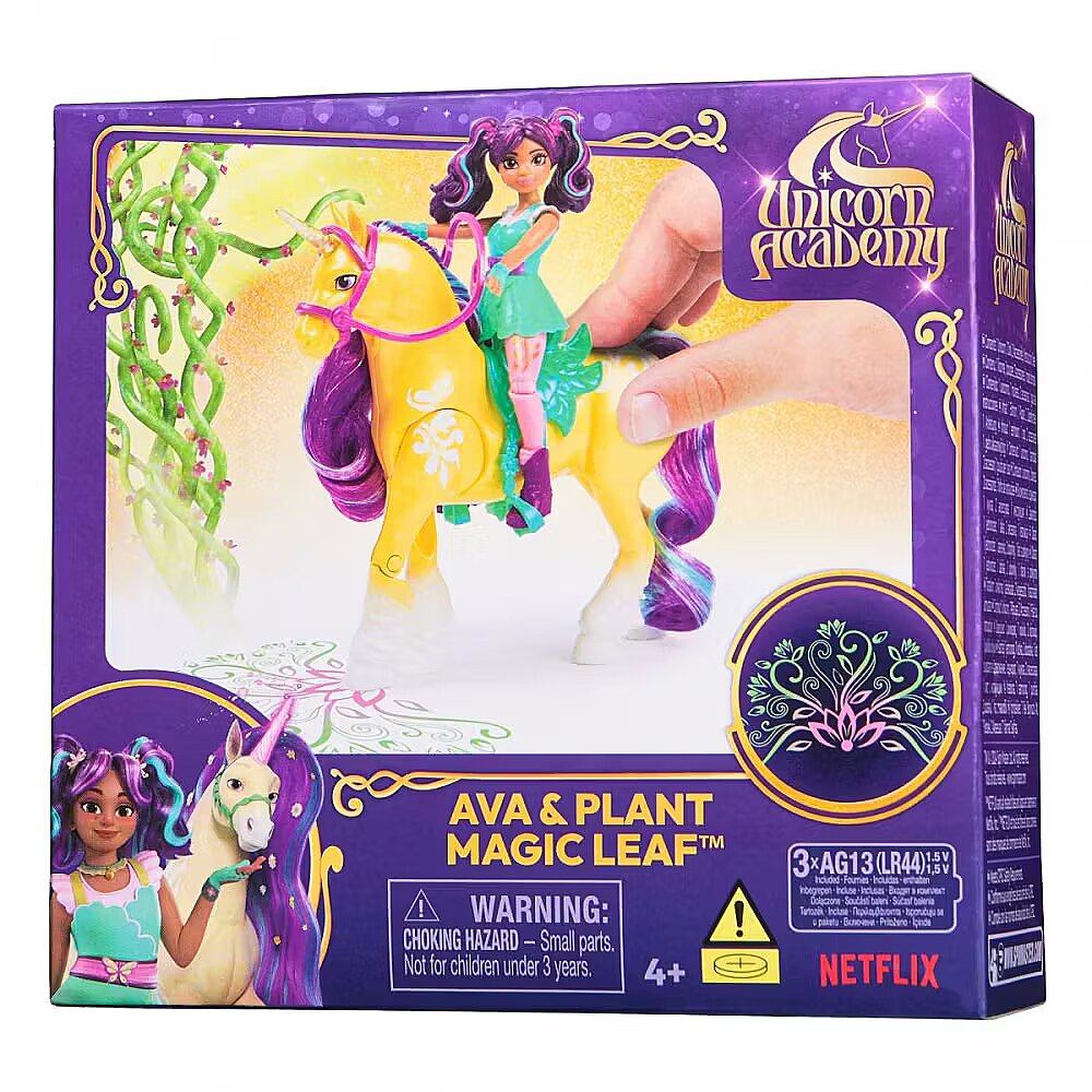 LongDesc - Experience the magic of Unicorn Academy with Ava & Plant Magic Leaf. Inspired by the NETFLIX animated show and best-selling book series where friendship reins, this duo celebrates the unique bond between rider and unicorn. With their true-to-show details and soft mane and tail, and real light effects on Leaf, this set will spark enchanting imaginative play. Featuring 7 points of articulation, pose Ava to ride Leaf and press the butterfly marking button on the unicorn’s side to activate the lights (3 LR44 batteries included) as you recreate your favorite scenes. Leaf stomps her hoof, using her Plant Magic to project a colorful pattern, like in the show. Ava securely stays in place on Leaf with the removable bridle and saddle accessories. For more ways to experience Unicorn Academy with your favorite characters, look for the other small dolls, including Sophia, Layla, Isabel, Valentina, and their unicorns (sets sold separately) and expand your world. For kids who enjoy unicorns and horse toys, dolls & accessories, doll house play, collectibles, plush toys and more, Unicorn Academy toys are fun birthday gifts for girls or gifts for any occasion. Shine bright in your Unicorn Academy adventures with Ava & Plant Magic Leaf.Includes: 1 Doll, 1 Unicorn, 2 Removable Accessories (Bridle & Saddle), 1 Instruction Sheet