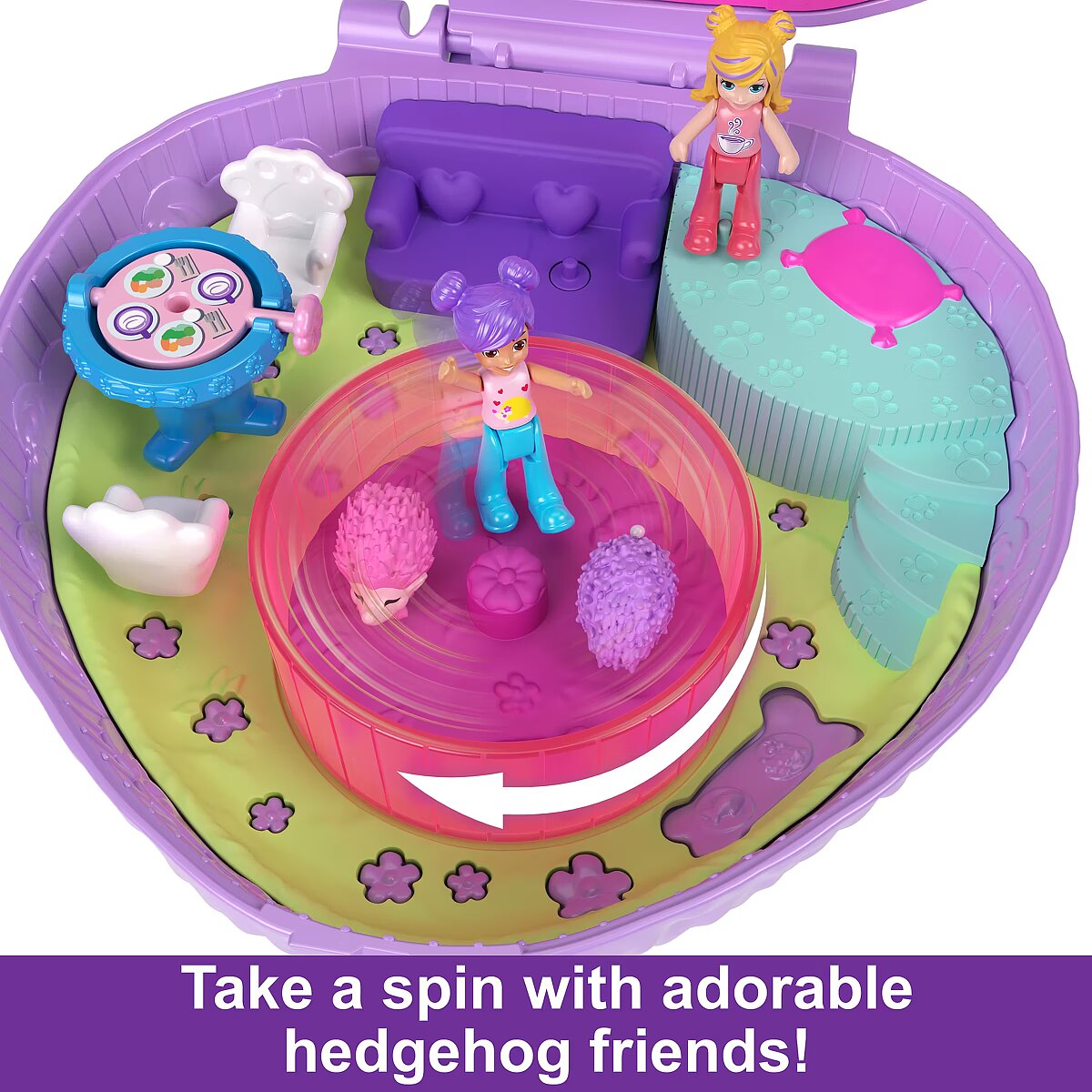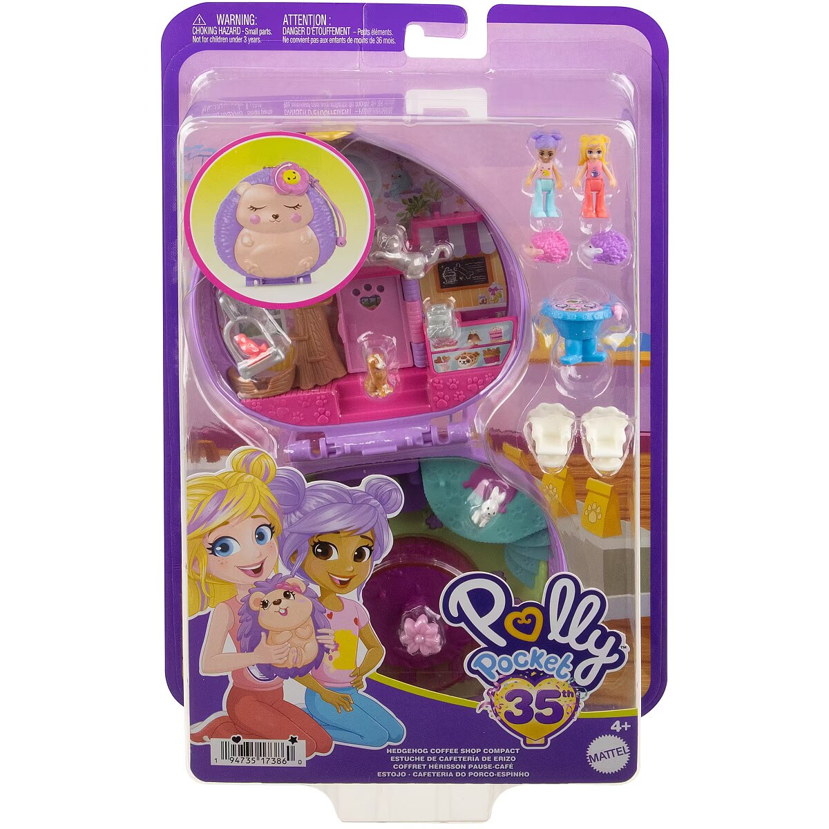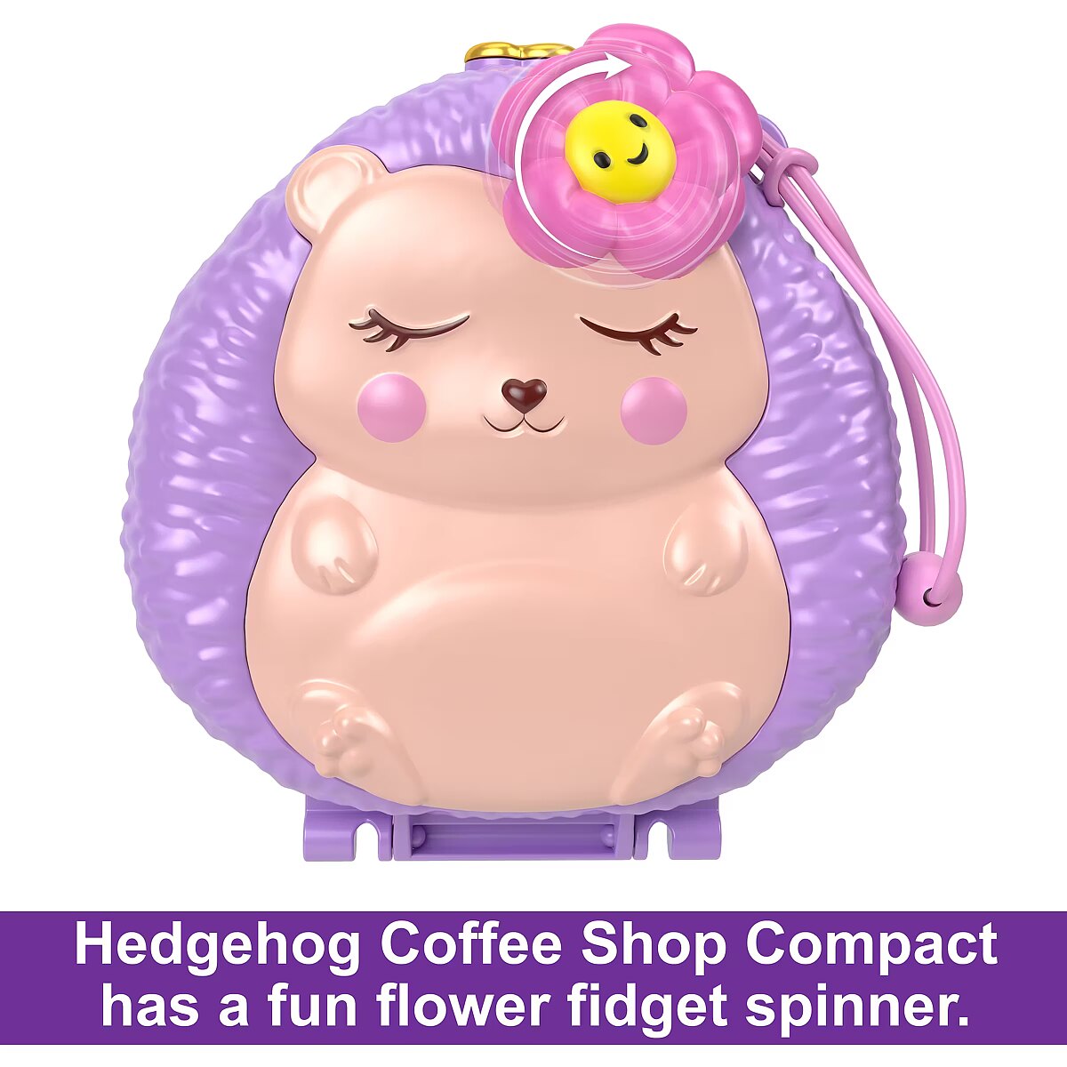 LongDesc - Come along for an animal-themed adventure in this Hedgehog Coffee Shop Compact! The exterior is shaped like an adorable hedgehog with a fidget spinner flower feature! The compact opens to a hedgehog playground and coffee shop with 2 micro dolls, 4 storytelling features, and 10 accessories including 9 pets! Polly doll loves spinning with baby hedgehogs on the playground! Hang the bird cage or flip the table over to reveal snacks for Polly doll and friends! It's an animal extravaganza! When it's time to go, pack it up for on-the-go fun. The perfect gift for ages 4 years old and up, especially those who love animals! Colours and decorations may vary.