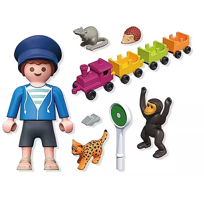Accessories included - Figures: 1 boy Animals: 1 baby cheetah, 1 rat, 1 baby monkey, 1 baby hedgehog Accessories: 1 toy locomotive, 1 hat, 1 trowel
