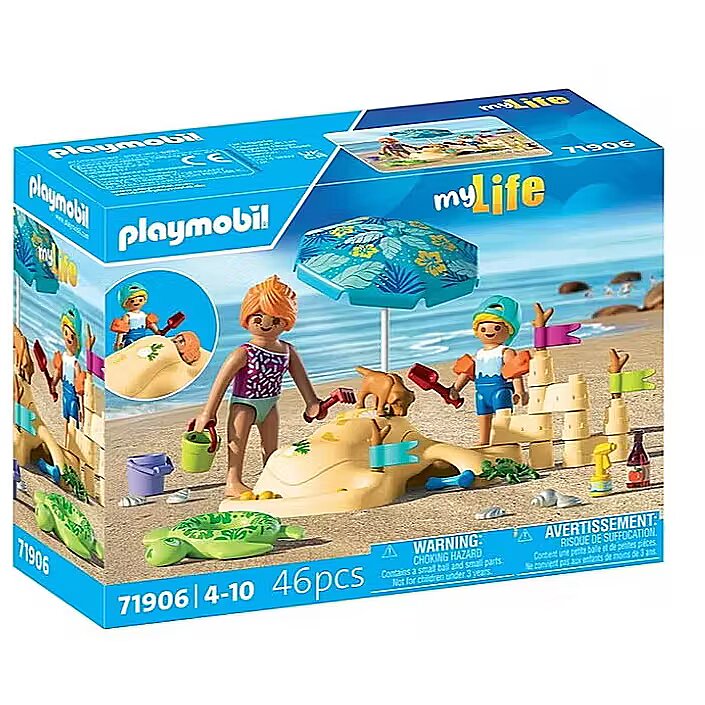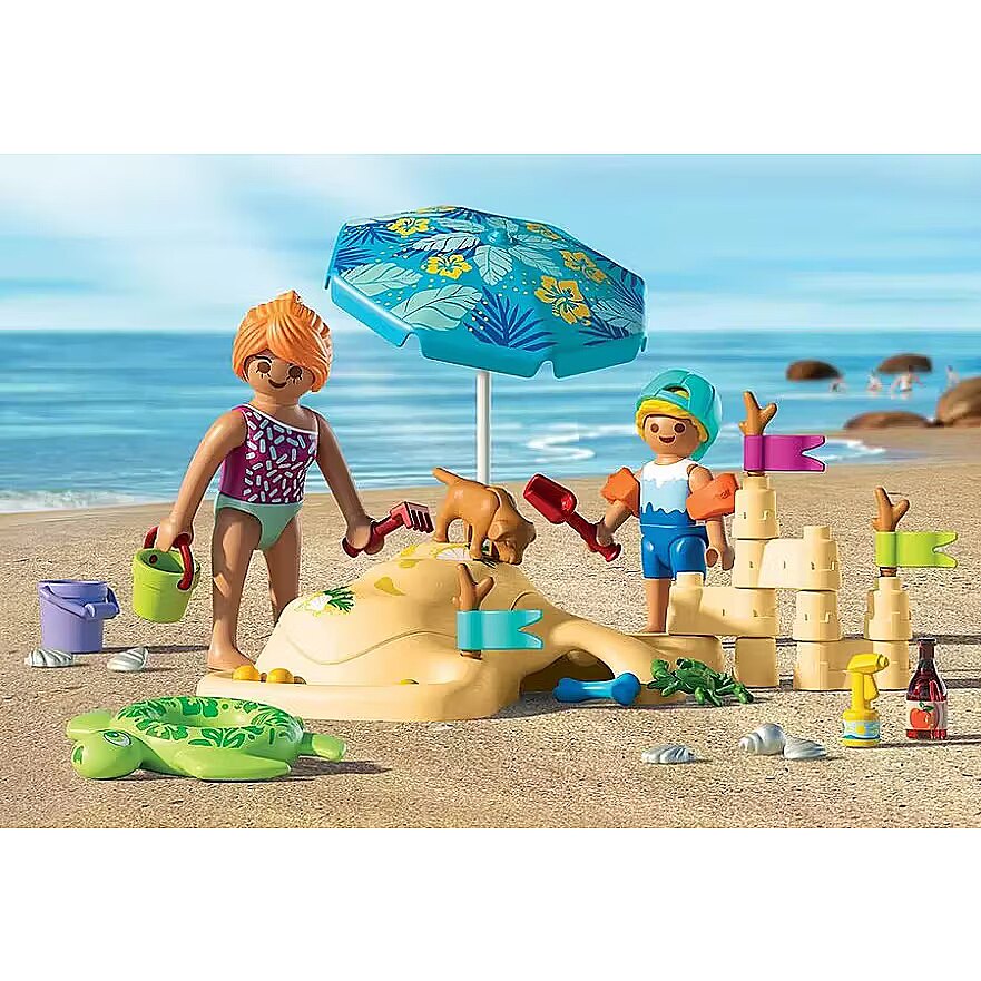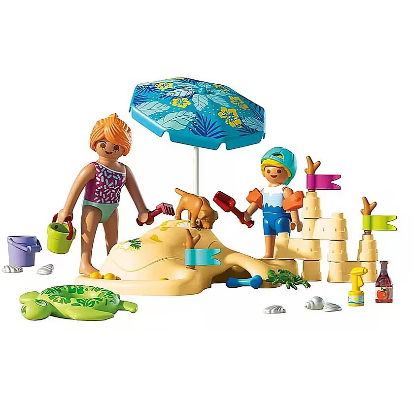 Description - What a wonderful summer day! The sand beneath your feet is wonderfully warm. A little boy has already built a large sandcastle and is now playing with his mom, burying her in the sand-only her head is still visible. The dog dropped a bone and, following the scent, curiously peeked toward a small hole in the sand. There, a crab was hiding, looking for a shady spot. Time for beach fun with PLAYMOBIL! Children can build their dream sandcastle using the pieces for endless arrangements, roll balls down a mini water stream, and even bury a figure under the removable cover. The umbrella and flags can be arranged in any way on the beach to create a new scene each time. The set includes a cheerful dog, a curious crab, and plenty of beach accessories, from shells and buckets to a swim ring and sunscreen. This colorful PLAYMOBIL set is perfect for sunny, creative adventures full of laughter, imagination, and beach surprises!