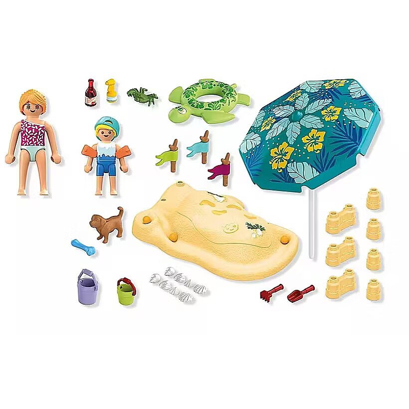 Accessories included - Figures: 1 woman, 1 boy wearing a cap Animals: 1 dog, 1 crab Accessories: 1 beach element with removable cover and individual sandcastle pieces, 1 umbrella, 3 flags on a pole, 3 balls, 1 shell set, 1 bottle with drink, 1 sunscreen, 1 bucket with shovel and rake, 1 swim ring, 1 pair of arm floaties