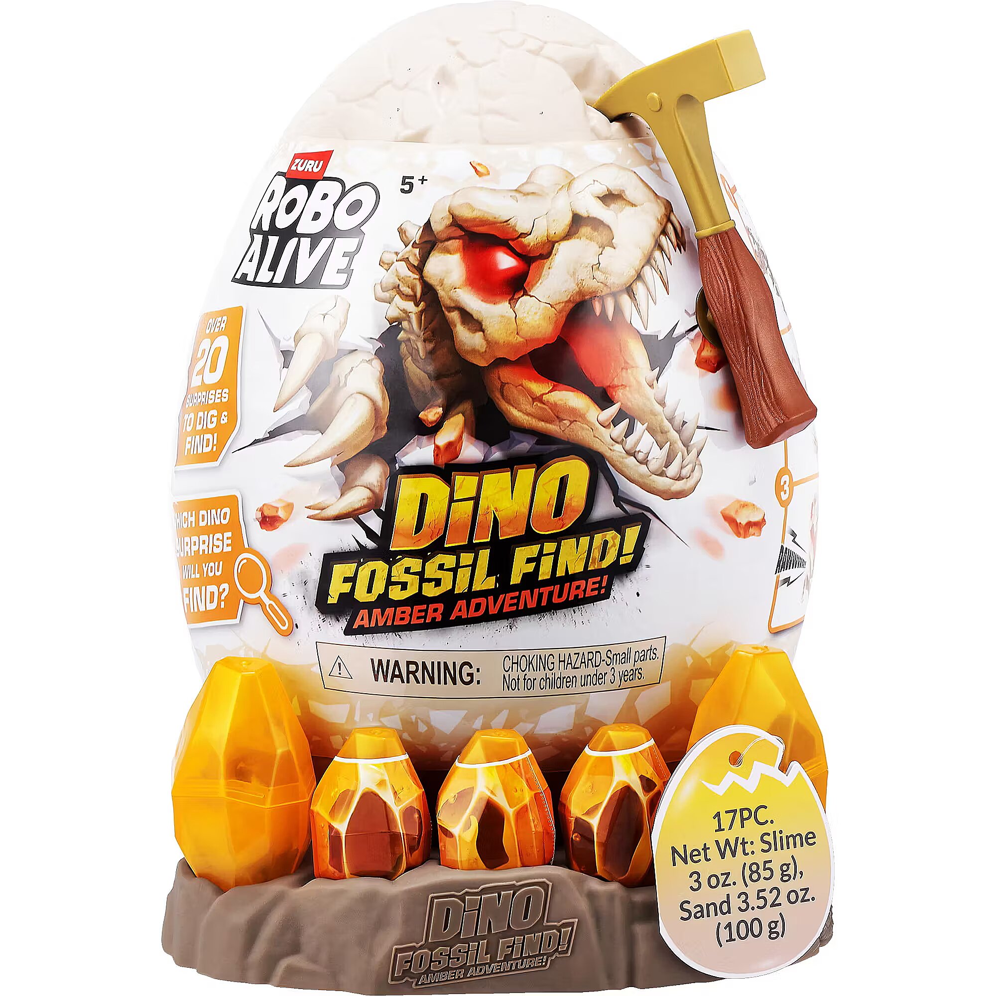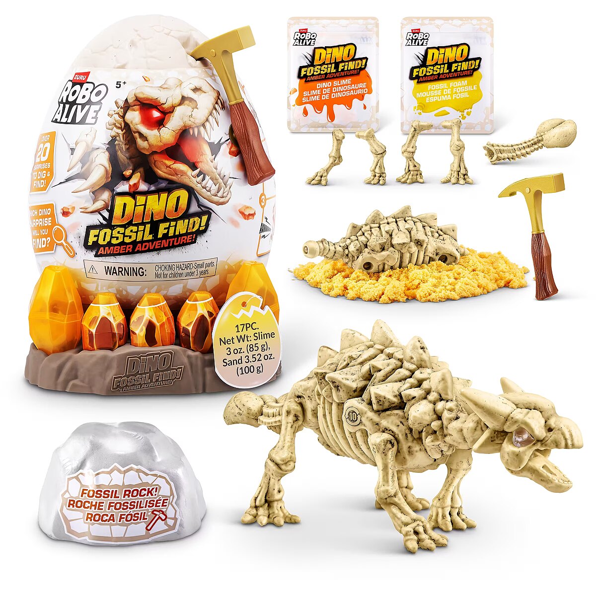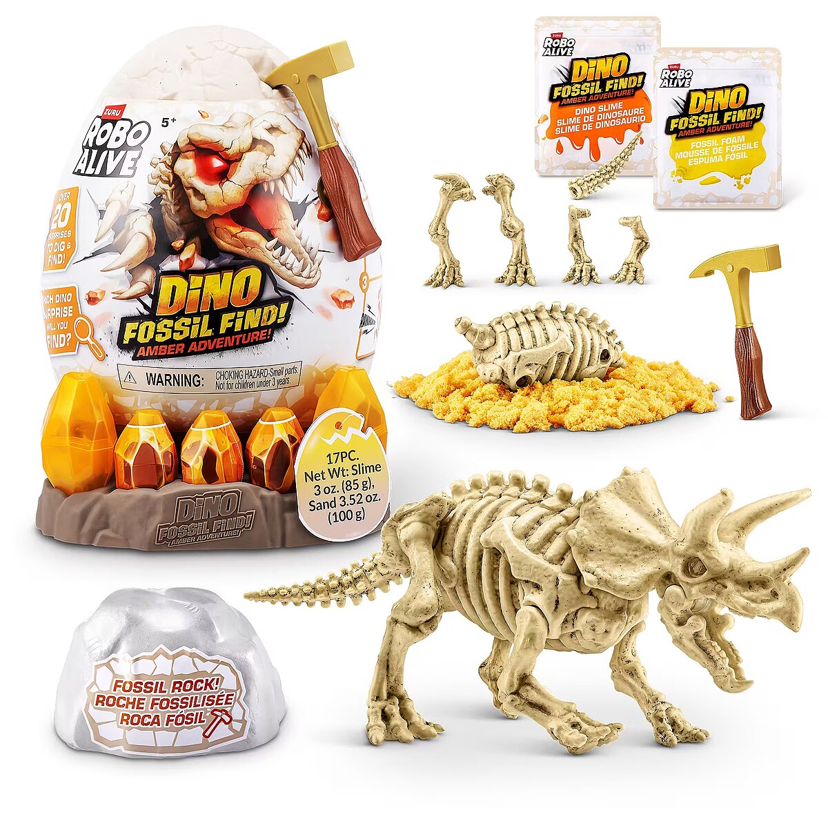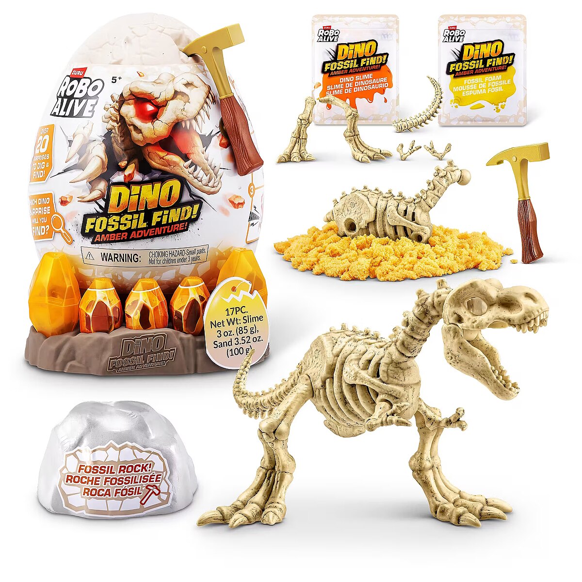 LongDesc - Calling all explorers! Embark on an exhilarating journey with Robo Alive Fossil Find Amber Adventure! Delve deep into layers of rock and sand, and be careful of the Magma glow-in-the-dark slime that adds an unexpected twist to your excavation. Unearth hidden dinosaur fossils and enchanting Amber eggs. Assemble the fossils to see your dinosaur spring to life with stunning light-up features. This interactive adventure offers the thrill of discovery and the fun of collecting and building four unique dinosaurs. Engage in this captivating exploration and experience the wonder—what ancient dinosaur will reveal itself from your exciting search?
