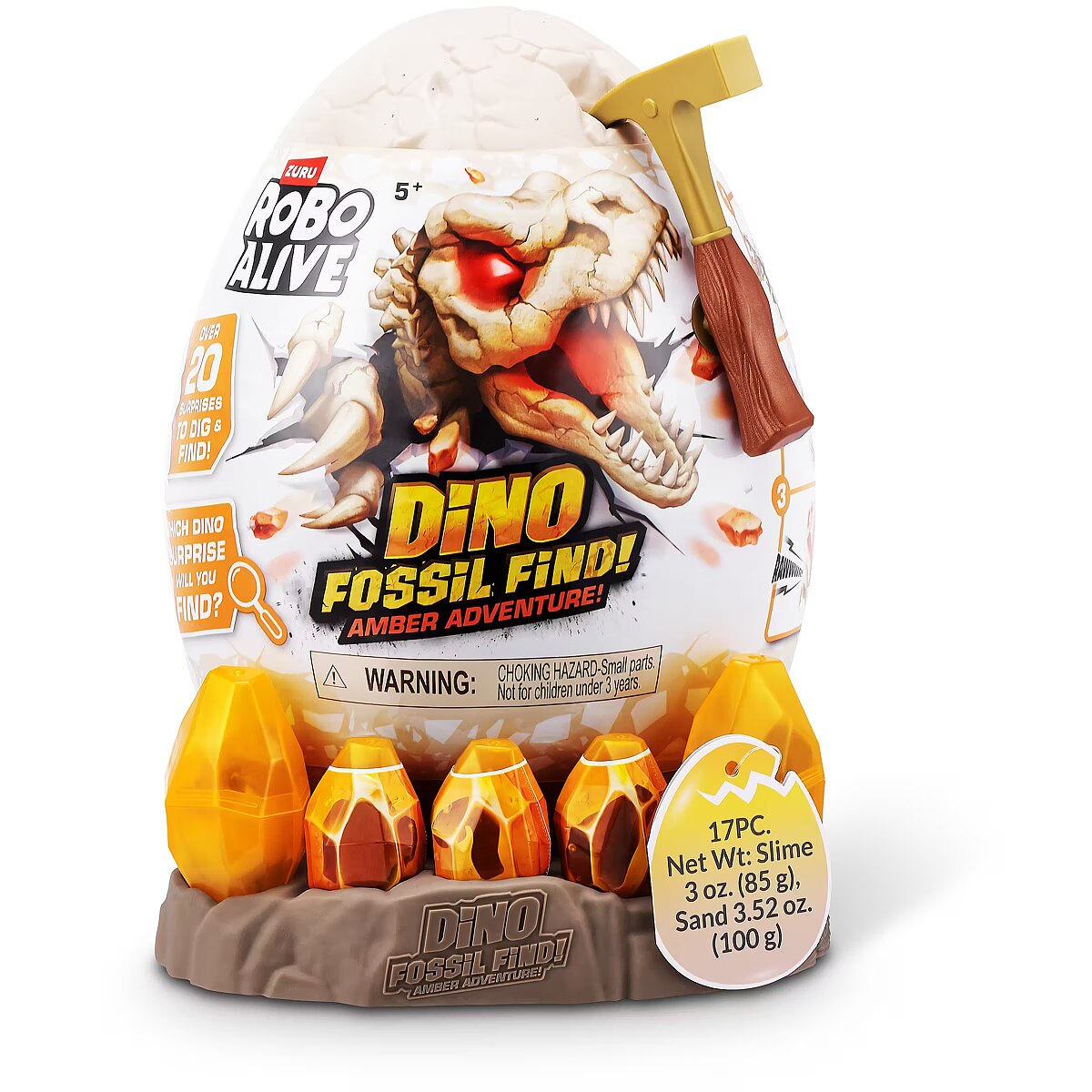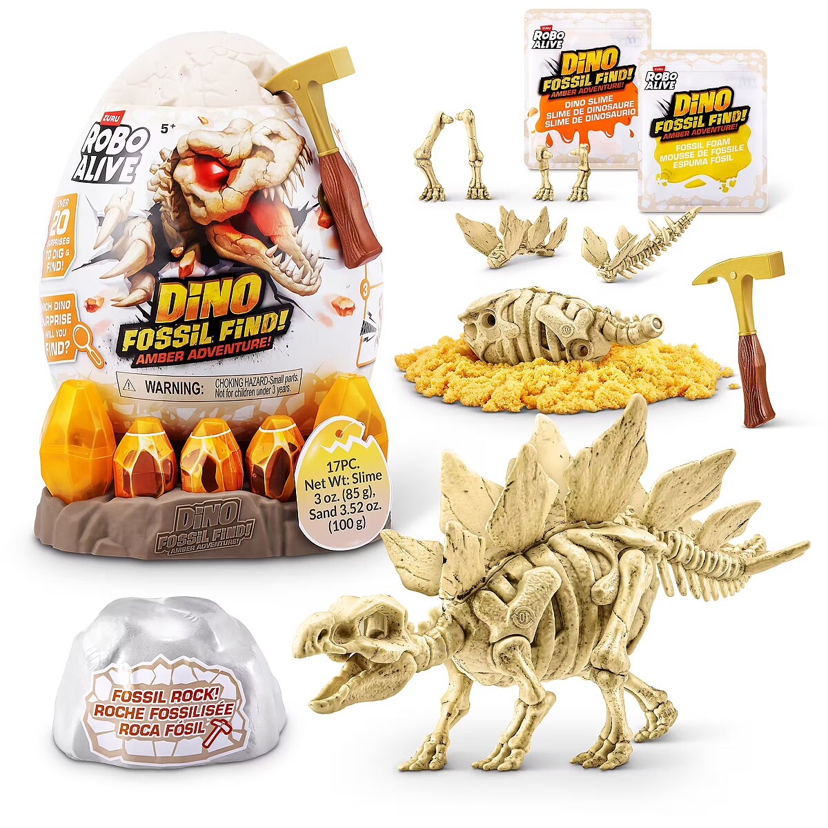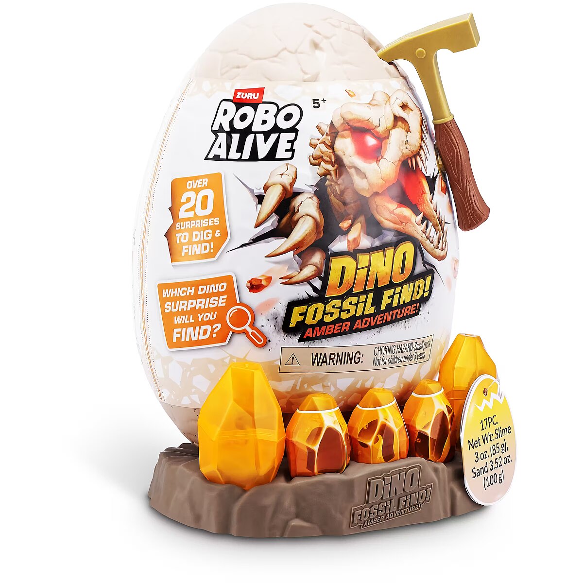 LongDesc - Calling all explorers! Embark on an exhilarating journey with Robo Alive Fossil Find Amber Adventure! Delve deep into layers of rock and sand, and be careful of the Magma glow-in-the-dark slime that adds an unexpected twist to your excavation. Unearth hidden dinosaur fossils and enchanting Amber eggs. Assemble the fossils to see your dinosaur spring to life with stunning light-up features. This interactive adventure offers the thrill of discovery and the fun of collecting and building four unique dinosaurs. Engage in this captivating exploration and experience the wonder—what ancient dinosaur will reveal itself from your exciting search?
