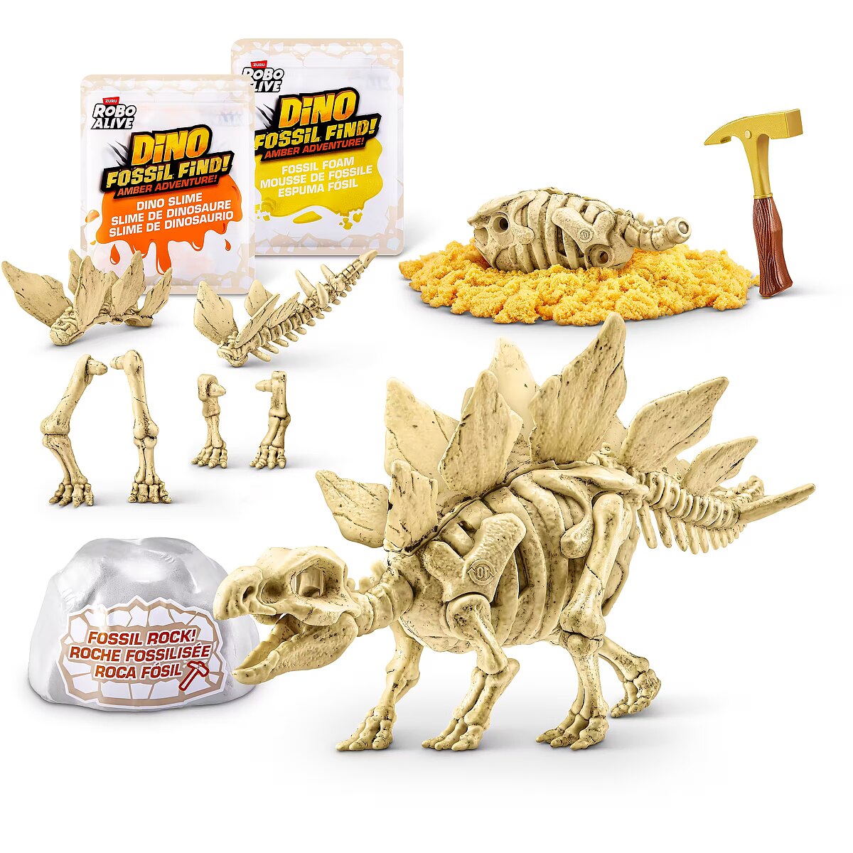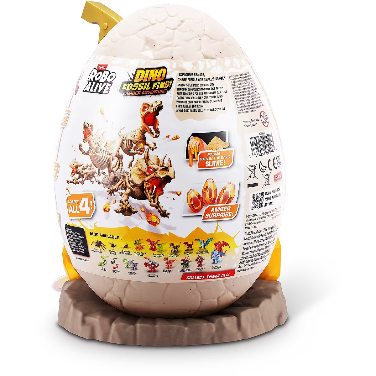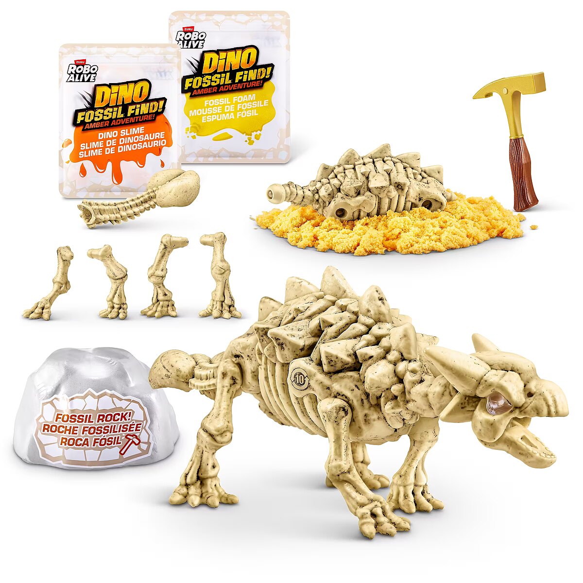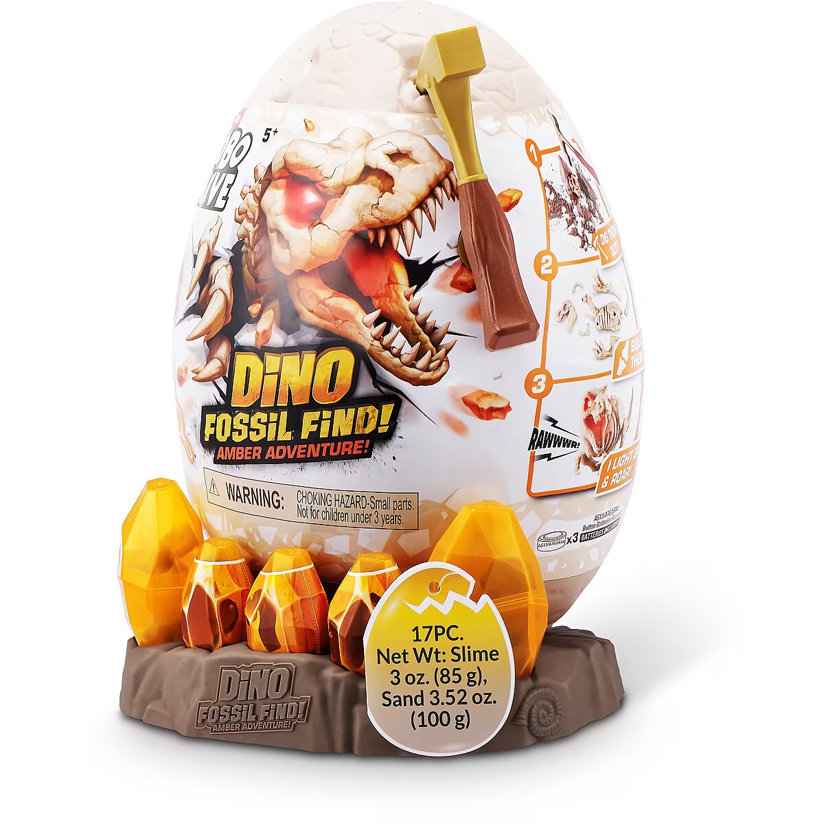 LongDesc - Calling all explorers! Embark on an exhilarating journey with Robo Alive Fossil Find Amber Adventure! Delve deep into layers of rock and sand, and be careful of the Magma glow-in-the-dark slime that adds an unexpected twist to your excavation. Unearth hidden dinosaur fossils and enchanting Amber eggs. Assemble the fossils to see your dinosaur spring to life with stunning light-up features. This interactive adventure offers the thrill of discovery and the fun of collecting and building four unique dinosaurs. Engage in this captivating exploration and experience the wonder—what ancient dinosaur will reveal itself from your exciting search?