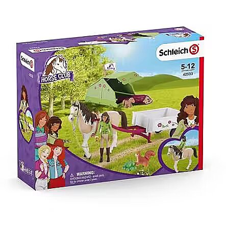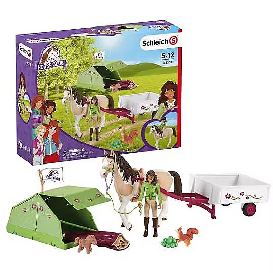 LongDesc - A love of camping and a love of horses go hand-in-hand with HORSE CLUB Sarah's Camping Adventure. Let's pitch a tent, unroll a sleeping bag, and tell a hundred stories with this horse and rider playset from schleich®. Suitable for kids ages 5 and up.Where will Sarah's camping adventure take her today...a forest in the mountains? A wind-swept meadow in the valley? Adventure awaits in the great outdoors! The Camping Adventure playset makes a great gift to expand your schleich® HORSE CLUB collection. The playset comes with a toy tent and fun accessories like a sleeping bag, a playful squirrel, apples for Sarah's horse and more. You can even personalize Sarah's tent with the flower stickers that come with it. Combine this playset with our Camping Accessories kit (sold separately) for even more fun and adventures. schleich® HORSE CLUB playsets and figurines introduce the limitless possibilities of storytelling and imaginative play. Featuring dozens of toy horses, riders and accessories, schleich® HORSE CLUB lets your adventure stories run wild. Horse figurines canter in rich detail, while authentic playsets provide an always expanding setting for the adventures of Hannah, Sofia, Lisa and Sarah! Our horse and rider figurines love to be whisked away into stories featuring other schleich® play worlds, from the grasses of the savannah to the majestic pines of the forest! schleich® toys and playsets are built to last for generations. All our toys meet the highest national and international safety standards.