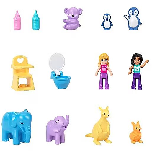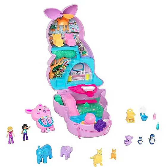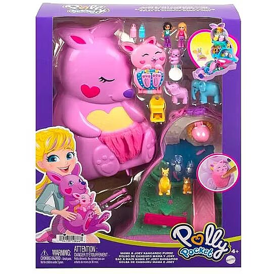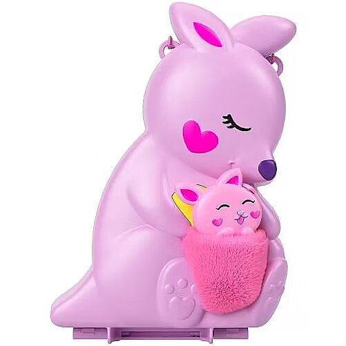 LongDesc - This Polly Pocket Mama and Joey Kangaroo purse makes it easy to take toys -- and fun -- on the go! The 2-in-1 playset has an adorable kangaroo exterior featuring a soft pouch with smaller joey compact that fits inside. Kids can take care of baby animals in the nursery with lots of themed activities like rocking cribs and bottle feeding. The set offers complete storytelling with two micro dolls, seven animals and accessories, some that Pop and Swap. When it's time to travel, kids can close the set with pieces inside to store and use the strap to carry as a purse or cross-body bag. Colours and decorations may vary.