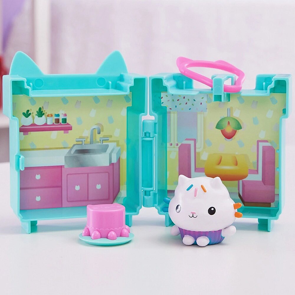 LongDesc - Enjoy pretend-play fun on-the-go with the Gabby’s Dollhouse Clip-On Playset! Featuring Gabby’s Cat-tastic friend MerCat, in the super-cute dollhouse bathroom, this portable playset comes with a miniature dollhouse room with a plastic backpack clip, so you can take it with you anywhere! Fans of the Gabby’s Dollhouse series will love hanging this mini playset from a bag, or backpack, to take their exciting dollhouse adventures with them wherever they go! Take your mini playset with you in the car, on a train, or even an airplane and once you’re seated, pop open the playset to reveal a mini dollhouse room, so you can relive your favorite scenes from the show! Then, just like Gabby does at the beginning of each episode, unbox your dollhouse delivery and discover the surprise accessory, a perfume bottle, to use on your playtime adventure! When playtime is over, put MerCat and your accessories inside the playset, snap it shut, then hang it on your backpack until it’s time to play again! For even more exciting dollhouse escapades, collect all three of the Gabby’s Dollhouse stackable mini playsets, like Baby Box Cat’s Craft Room and Cakey Cat’s Kitchen! (Each sold separately) For one last surprise, scan the QR code inside the Dollhouse Delivery to unlock a special reward in the free Gabby’s Dollhouse App (available on iOS and Android). Gabbys Dollhouse stuffed animals, dolls, toy figures and playsets are the perfect toys for girls and boys that love using their imagination to create their own dollhouse world!INCLUDES: 1 Playset, 1 Backpack clip, 1 MerCat Figure, 1 Dollhouse Delivery, 1 Accessory