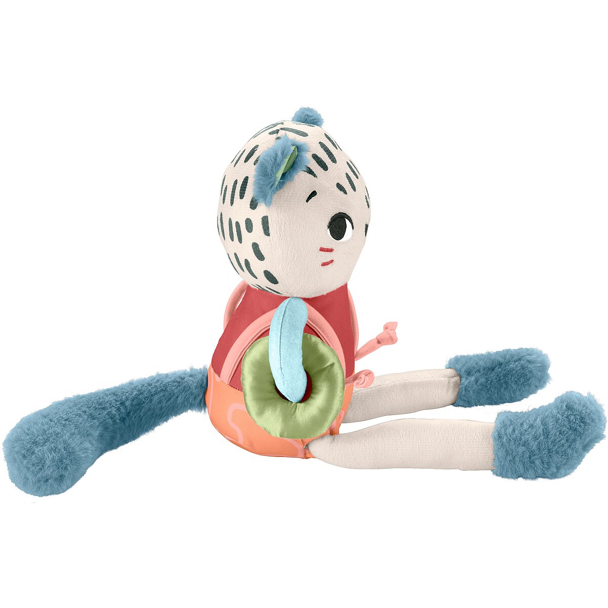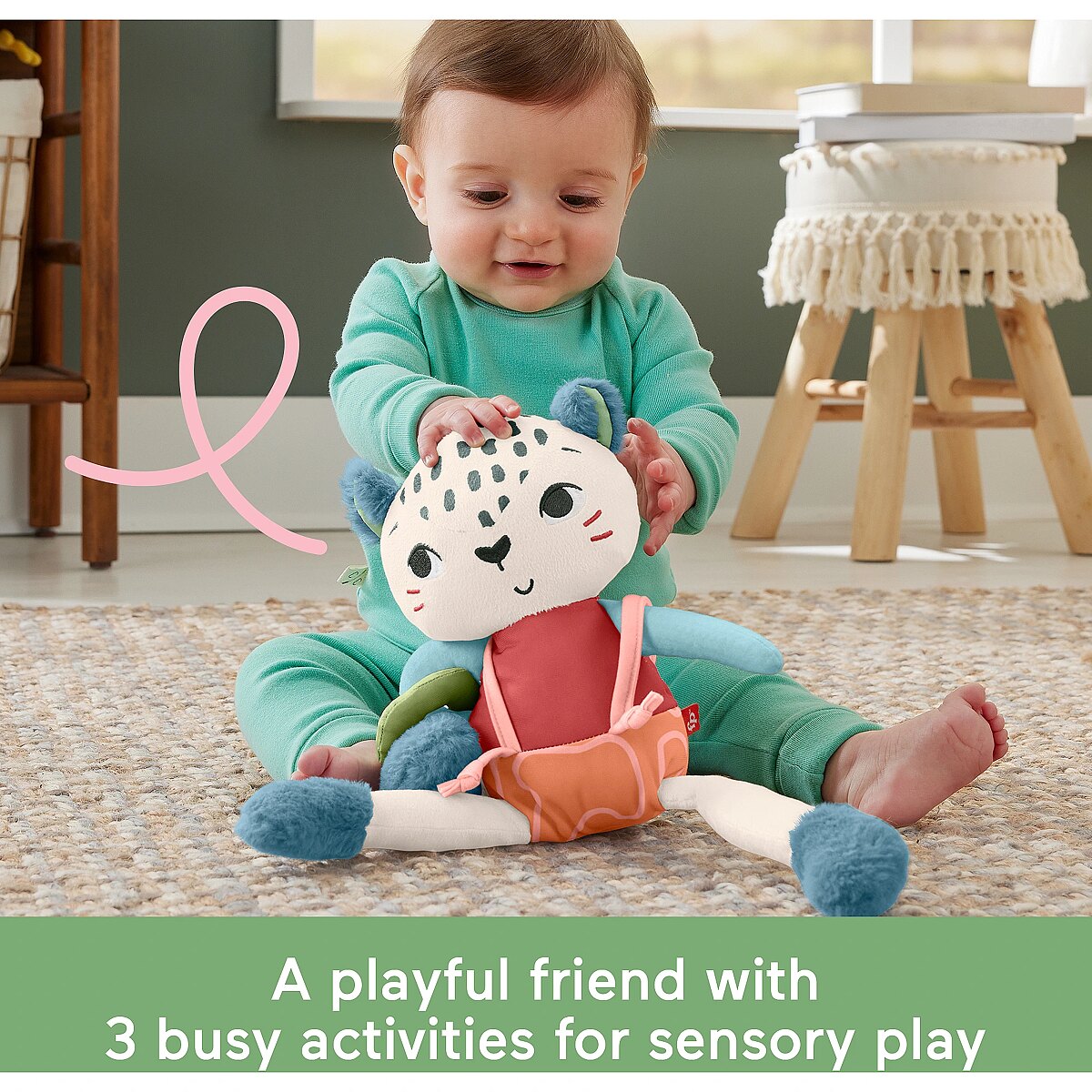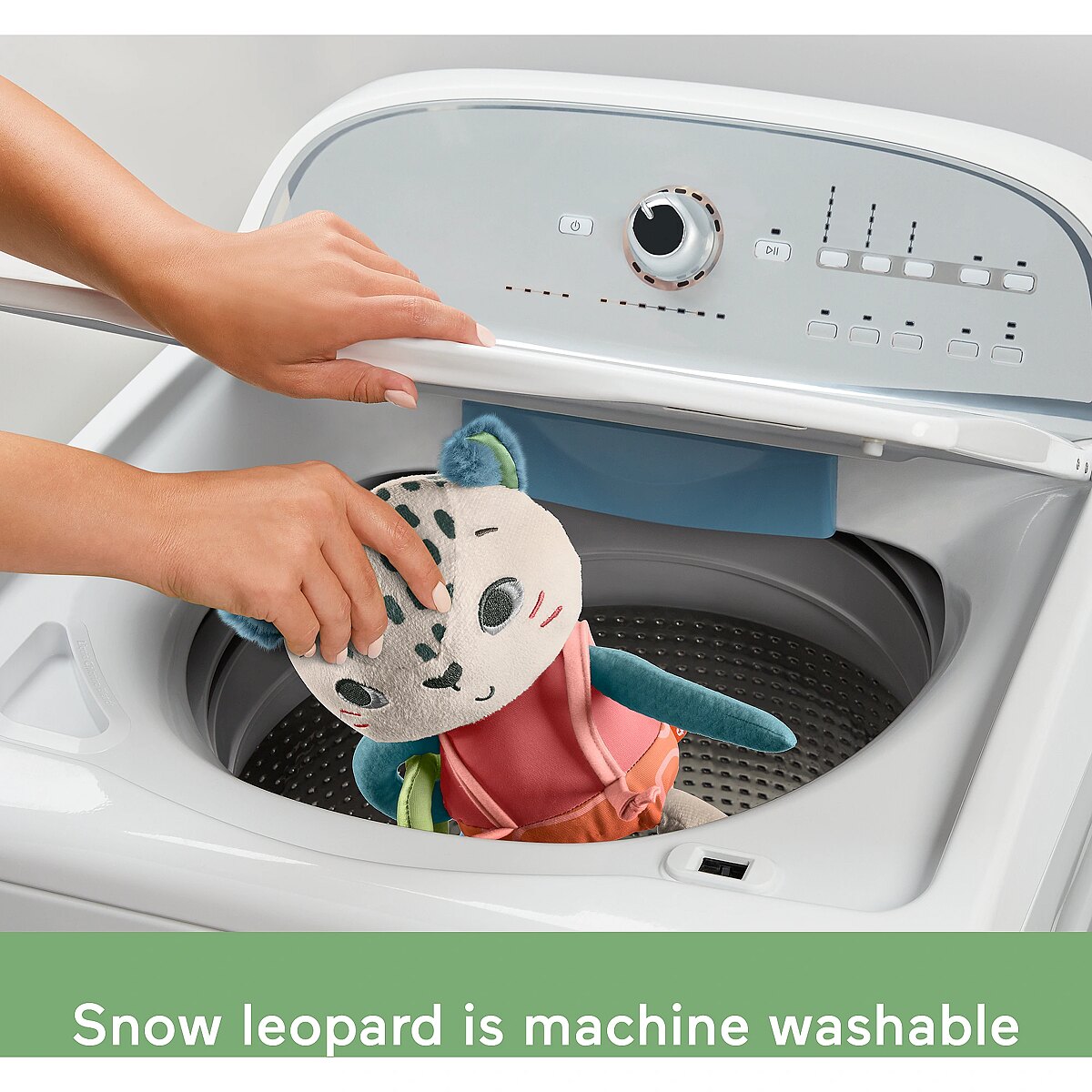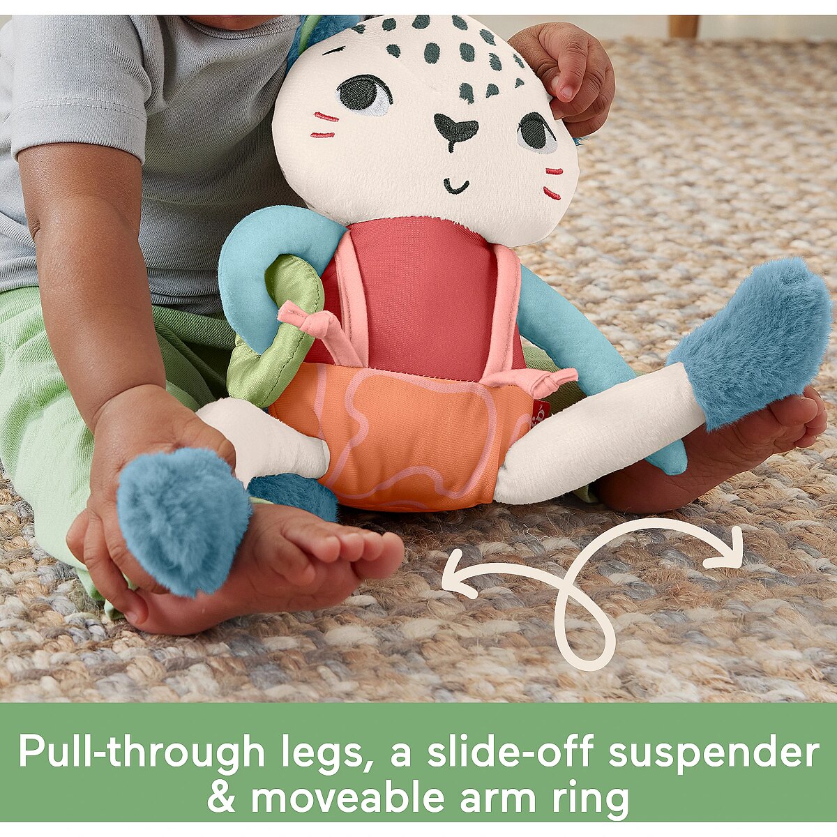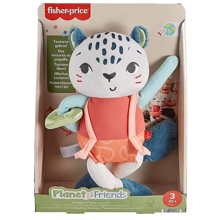 LongDesc - Inspired by animals that are endangered or vulnerable, the Planet Friends Spotting Fun Snow Leopard baby sensory toy from Fisher-Price uses fabric made 95% post-consumer recycled plastics and comes in packaging made with FSC-certified paper to support responsible forestry. This plush toy features satiny fabrics, soft fuzzy crinkle boots and high-contrast colours to engage your baby’s senses. Fun fine motor activities include pull-through legs, a slide-off suspender and a soft sliding arm ring for your little one to discover. This toy can also help provide a sense of security for your baby at home or when traveling and is machine washable. (FSC C172210, 2021)