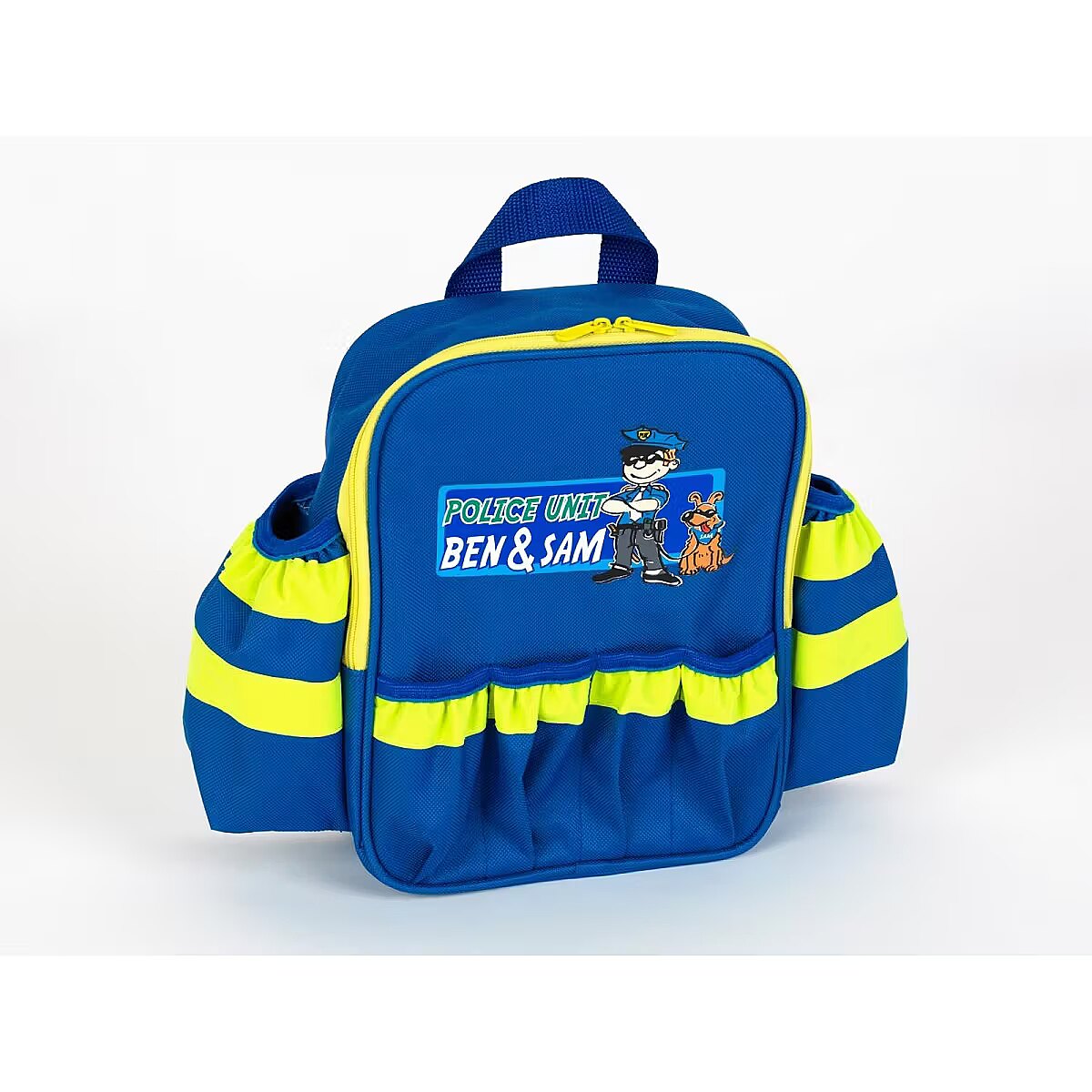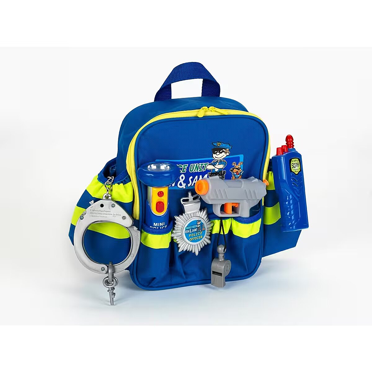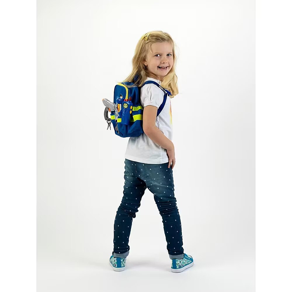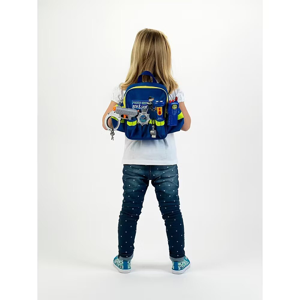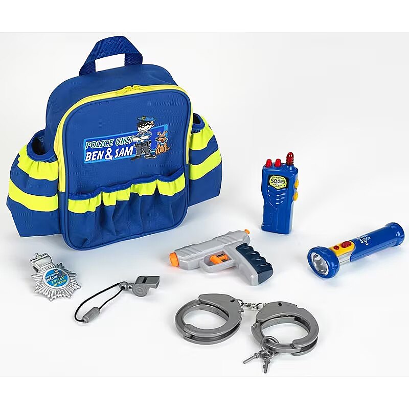 Description - Great little policeman's backpack from the renowned German company Klein. A high-quality set consisting of a backpack with reflective stripes, a torch, a short wave, a whistle, a police badge and a water pistol. The backpack is lined inside with police motifs. The torch lights up, the handcuffs can be closed just like the real thing. The large number of pockets allows you to pack the whole thing quickly and conveniently.