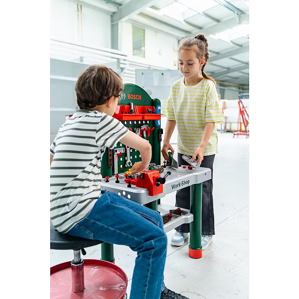 Description - Bosch Workshop 82 Pieces The fully equipped children's workbench is manufactured in Germany under Bosch license. The worktop offers numerous educational functions, a vice and practical storage compartments and 3 storage containers. On the back wall of the craft bench and on the shelf under the worktop there is space for high-quality accessories, some of which can be hung on the wall using practical hooks: flat and Phillips screwdriver, wrench, spirit level, pliers and file, hammer, saw, square and much more. Children quickly and playfully learn how to use strips, screws, nuts and screw elements of different sizes and shapes. Only in professional workshops can you play so practically and neatly! With this workbench, even the youngest learn to organize 82 pieces of accessories so that they are always at hand when it is time to screw screws into the worktop and fasten them with nuts or connect construction strips to create imaginative structures. The practical vice also helps to keep the strips in place. And when everything is well connected and securely mounted, everything can be quickly tidied up in the little craftsman's corner. Large tools are simply hung on the hooks, small parts go into the storage boxes and everything is ready for the next use.