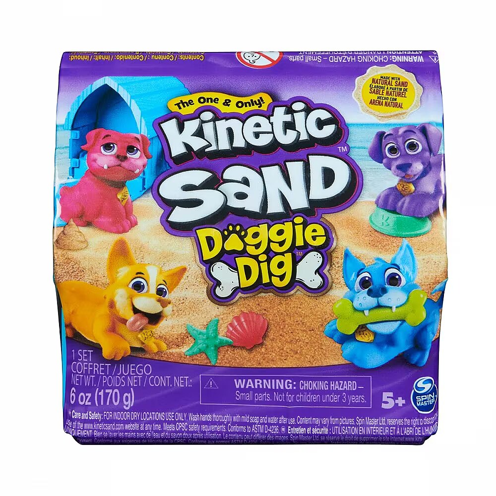 LongSummaryDescription - Kinetic Sand , Doggie Dig with Surprise Multipurpose Dog Tool, 6oz Beach Sand and Play Sand Storage (Styles May Vary), Sensory Toys for Kids. Product type: Children's kinetic sand, Recommended age (min): 5 yr(s), Art & craft parts included: Mould, Sand, Product colour: Multicolour. Package type: Closed box