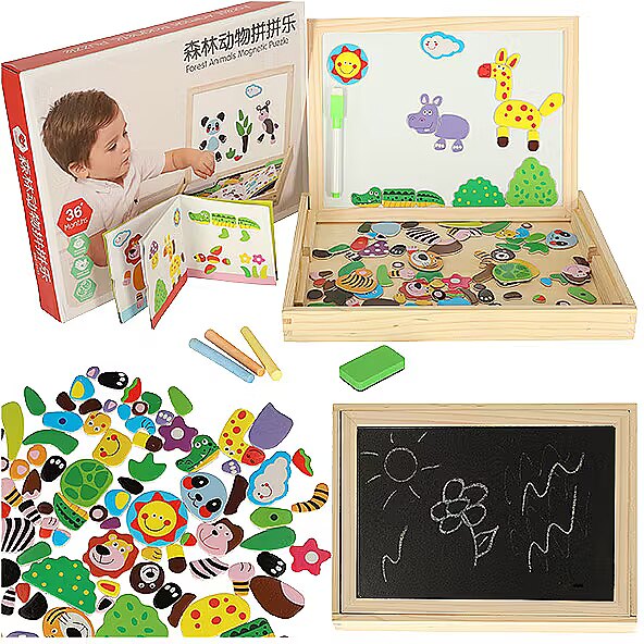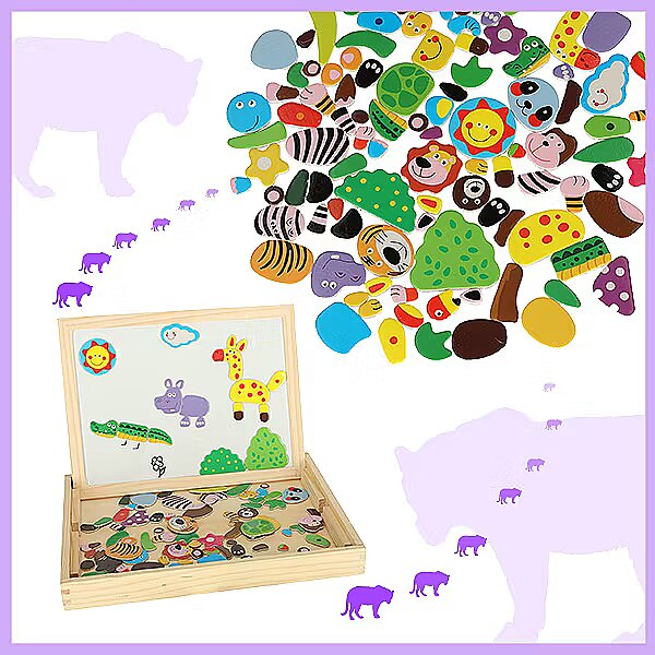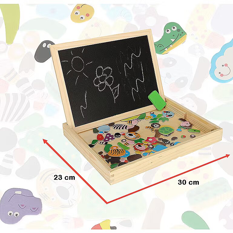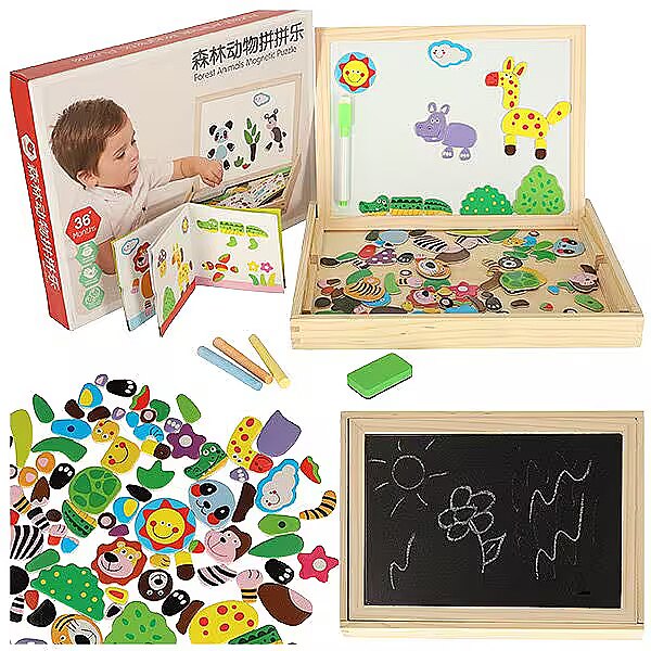 description_en - Double-sided wooden board with magnetic puzzles for arranging pictures.