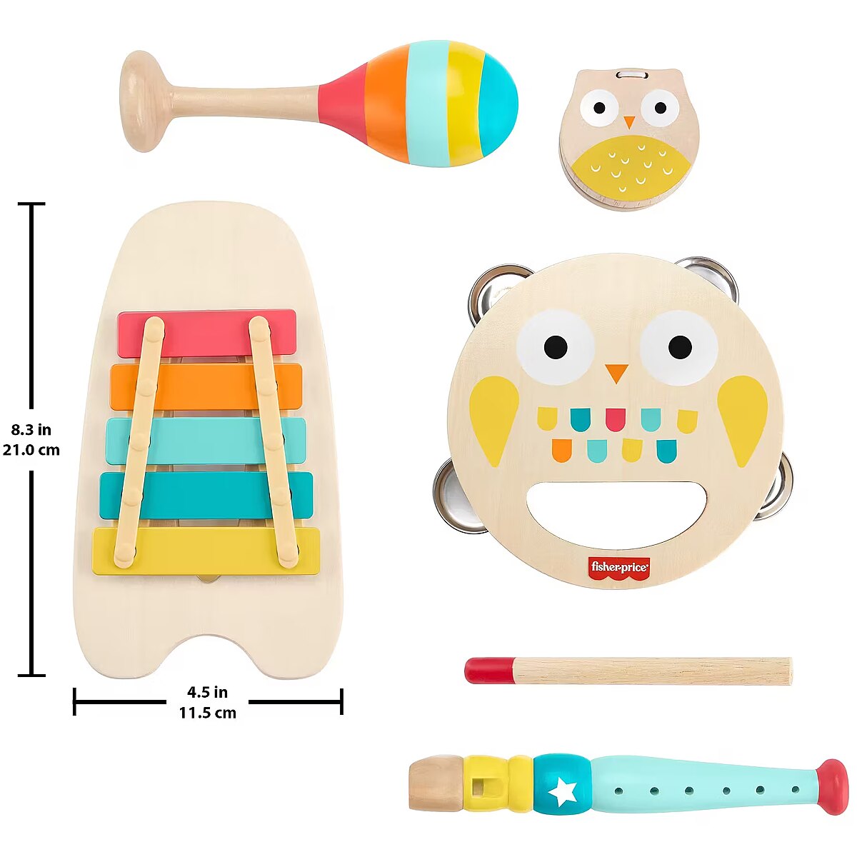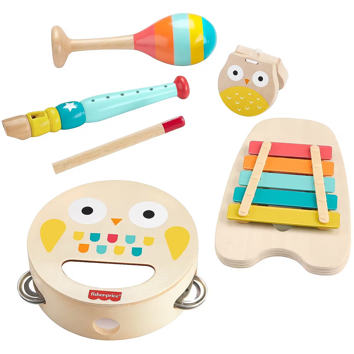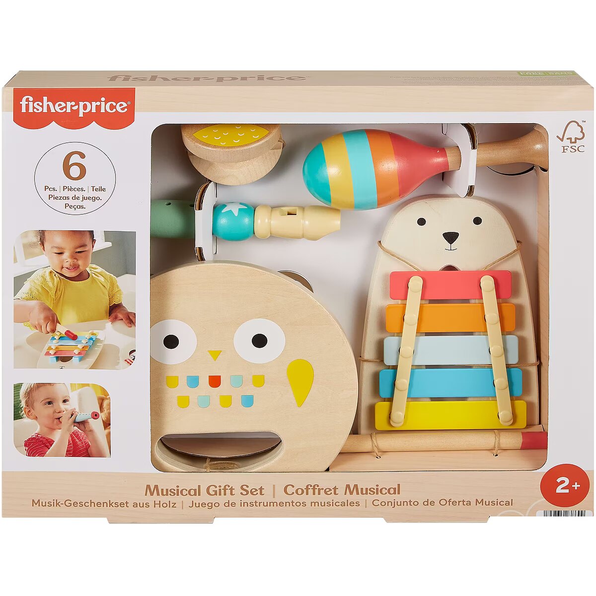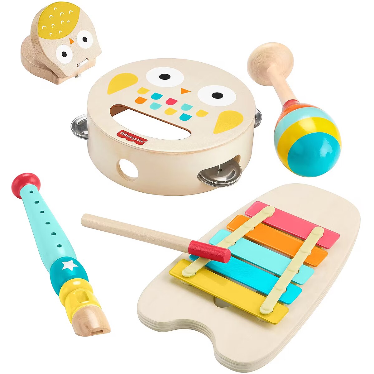 LongDesc - Toddlers can host their own jam sessions with this Musical Gift Set from Fisher-Price. This wooden toy instrument set includes a maraca, a xylophone with a mallet, a tambourine, a recorder and a castanet decorated with bright colours and friendly animal faces to inspire your child’s creativity. Plus, with more than one instrument, siblings and playmates can join the fun too! Made with wood from well-managed Forest Stewardship Council-certified sources (FSC-N004566).