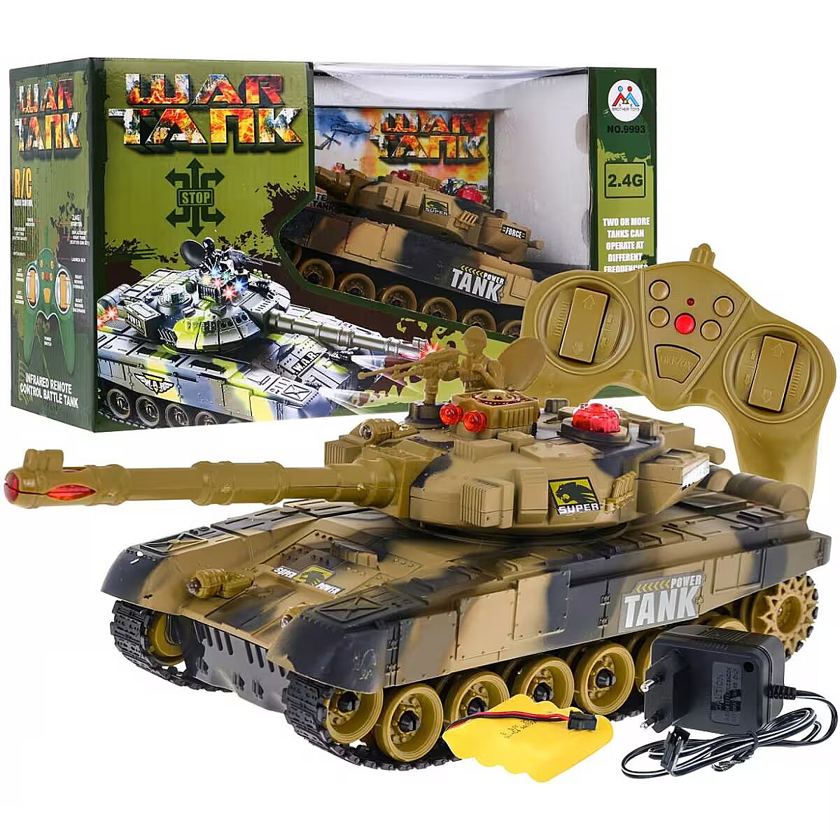 R/C tvertnes maskēšanās 2,4 GHz 2,4 GHz frekvence ļauj diviem vai vairākiem spēlētājiem vienlaikus vadīt transportlīdzekļus. Tālvadības tvertne ir lieliska dāvana rudens - ziemas vakaros. Lieliski izgatavots, ar lieliskiem skaņas un gaismas efektiem. Pēc izpakošanas no kastes tvertne ir gatava spēlei – to darbina uzlādējams akumulators. Tālvadības pults baterijas, kā arī USB lādētājs ir iekļautas komplektā. Iegādājoties divus tankus dažādās krāsās, mēs varam veikt lielisku cīņu starp tiem - Lielā tanku kauja! Rotējošais tornītis ir aprīkots ar stobru ar infrasarkano staru sistēmu. Pēc mērķēšanas un labā šāviena atgriešanas otrā transportlīdzekļa virzienā, jūs dzirdēsiet skaņu, ka mērķis tiek trāpīts. Viena no trim ienaidnieka tanka vadības ierīcēm izdzisīs, lai apstiprinātu trāpījumu. Pēc trim sitieniem ienaidnieka transportlīdzeklis tiks imobilizēts uz 15 sekundēm! Cīņa ir uzvarēta, un jūs varat sākt jaunu spēli no sākuma. Kāpurķēžu šasija - lieliski atdarina braukšanu ar īstu tanku. Instinktīva tvertnes vadība nesagādā nekādas grūtības un ir viegli apgūstama jau pēc dažiem mēģinājumiem. Mūsu kaujas mašīna spēj pārvarēt šķēršļus līdz 4 cm augstumā !!! Reālistisks transportlīdzekļa atsitiens šāviena laikā - mūsu transportlīdzeklis uzvedas kā īsts tanks kaujas laukā šāviena laikā. Tornī atvērta lūka - kurā varam ievietot tankkuģi ar ložmetēju. Stūre – transportlīdzekli var braukt uz priekšu, atpakaļ, pagriezt pa labi un pa kreisi un arī pagriezt vietā kā īstu tanku. SKAŅAS EFEKTI: - dzinēja troksnis, - lielgabala šāviena skaņa, - šaušanas ložmetēja skaņa. GAISMAS EFEKTI: - kvēlojošie priekšējie lukturi uz transportlīdzekļa un torņa, - elektroniskais jaudas indikators transportlīdzekļa aizmugurē. Komplektā ietilpst - 1 transportlīdzeklis, - 1 tālvadības pults, - 1 uzlādējamo bateriju komplekts (AA 700mAh, 4.8V), - 1 gab USB lādētājs uzlādējamām baterijām, Izmēri - garums apm. 340 mm. - augstums apm. 110 mm. - platums apm. 120 mm.