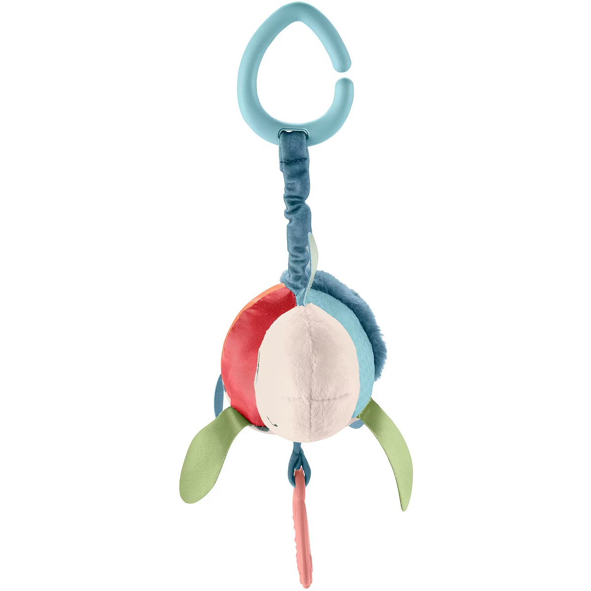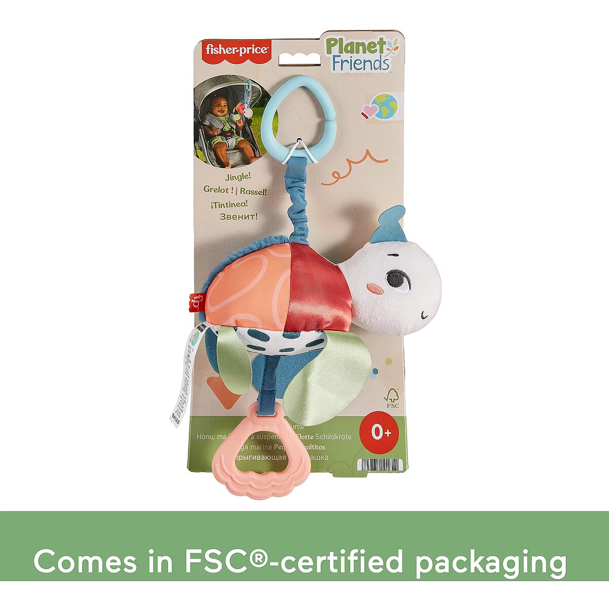 LongDesc - Inspired by animals that are endangered or vulnerable, the Planet Friends Sea Me Bounce Turtle plush stroller toy from Fisher-Price uses fabric made from 80% post-consumer recycled plastics and comes in comes in packaging made from FSC-certified paper to support responsible forestry. The toy features a variety of different tactile and visual elements for engaging sensory play and has a pull and release handle that activates the fun jingle sounds and bouncing action. The handle also doubles as a BPA-free seashell teether. This toy easily links to a stroller canopy, baby gym or diaper bag for travel use. (FSC C172210, 2021)
