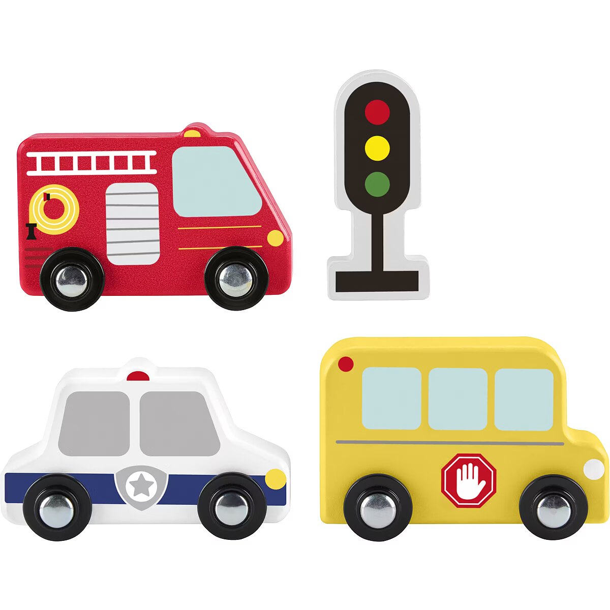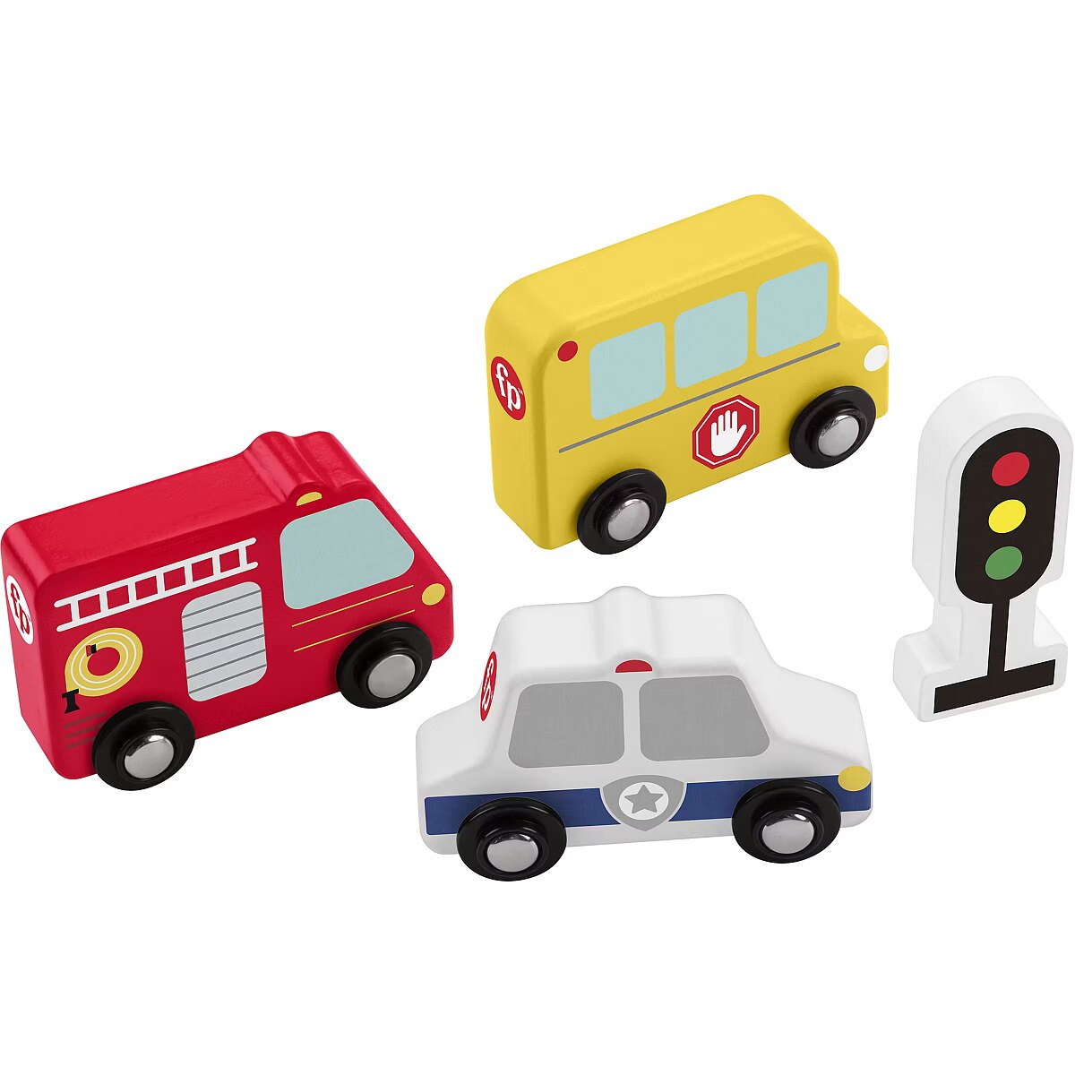 LongDesc - Toddlers and preschool kids can create their own stories with this set of push-along wooden vehicles from Fisher-Price. The Wooden Vehicle Pack features 3 transportation vehicles in fun, toddler-friendly themes including a fire truck, a police car and a school bus, plus a traffic light play piece. Made with wood from well-managed, Forest Stewardship Council-certified sources (FSC-N004566), these wood toys inspire storytelling play while helping kids strengthen their fine motor skills as they push and roll the vehicles. (Colour and decorations may vary.)