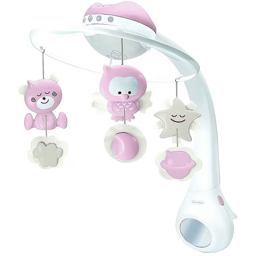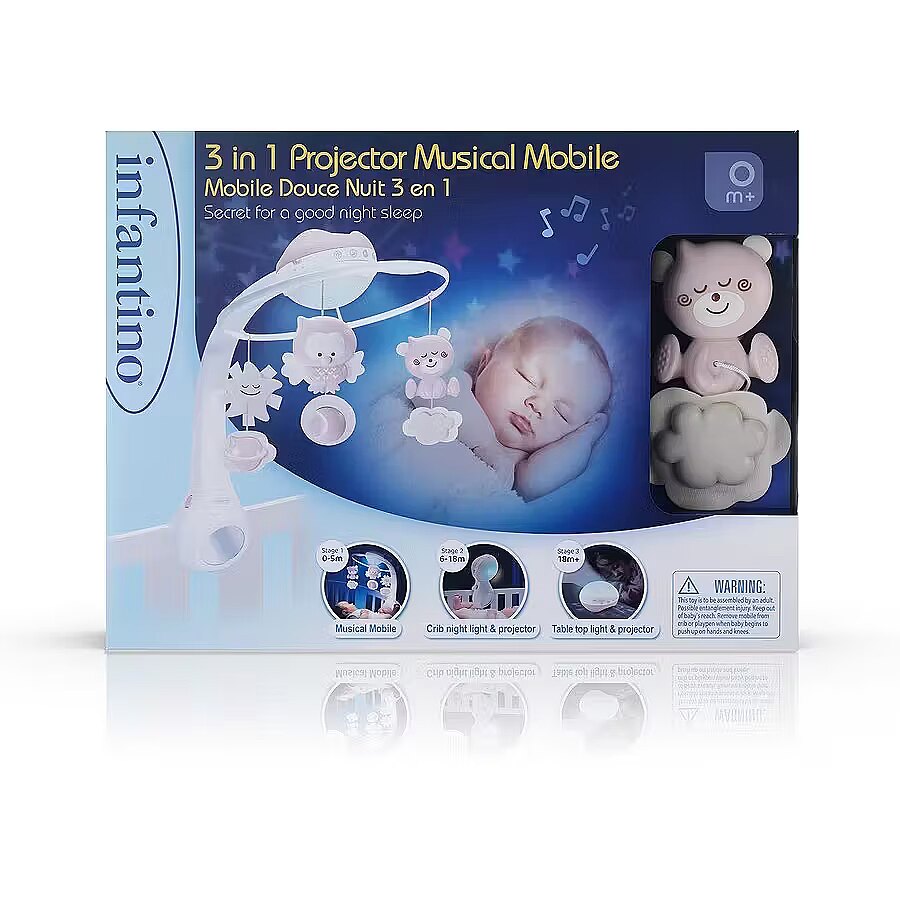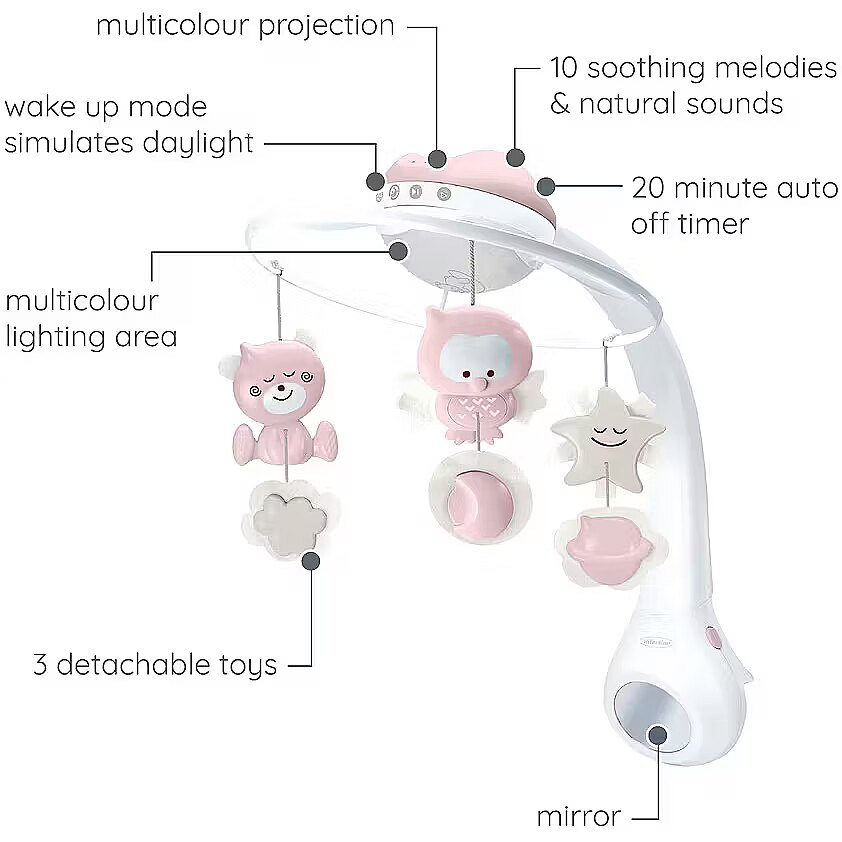 Description - Wielofunkcyjny projektorek dostosowuje się do różnych etapów rozwojowych Twojego maleństwa: Karuzelka z delikatnym światłem i muzyką 0-5M, Lampka nocna z muzyką montowana na łóżeczko 6-18M, Lampka z muzyką na stolik nocny 18M+. Projektor wyświetla gwiazdki oraz gra kojące melodie, które uspokajają dziecko pomagając mu zasnąć. Na karuzeli, przy dźwiękach muzyki kręcą się urocze zwierzątka. Urządzenie posiada 2 tryby odtwarzania: tryb dzienny i nocny. W trybie dziennym: 0-3 min. włączona jest tylko lampka. 4-15 min. włączona jest lampka i muzyka. 16-20 min. włączona jest lampka, muzyka i projektor. W trybie nocnym: 0-10 min. włączona jest muzyka, lampka oraz projektor. 11-20 min. włączona jest tylko lampka nocna, pozostałe funkcje są wyłączone. Projektor odtwarza 6 melodii i 4 odgłosy natury. Posiada funkcję regulacji głośności. Karuzelka 3 w 1 pomoże uciszyć maluszka światełkami, ruchem oraz muzyką i stworzyć mu rytuał zasypiania. Z łatwością można przymocować ją do łóżeczka.