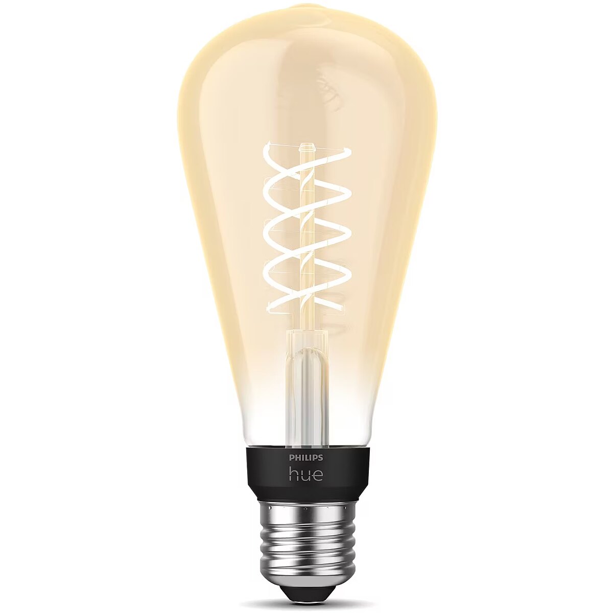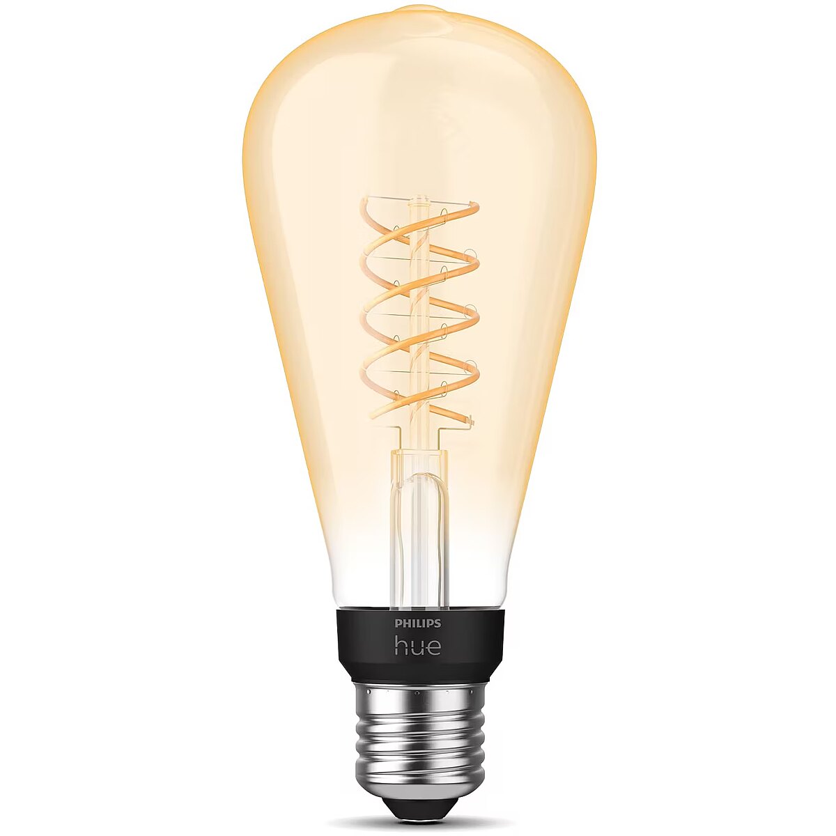 MediumDescription EN - This larger version of the Edison-style filament bulb, with its elongated shape, spiral filament, and elegant amber glass cover, combines a retro design with a modern touch. Use Bluetooth or pair it with the Hue Bridge to access additional smart lighting features. • Retro-style bulb with soft white light